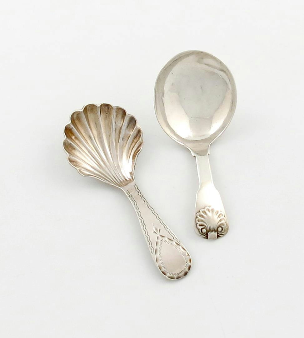 shell shaped bowl, the terminal with a vacant shield cartouche, plus a George III silver Fiddle and Shell pattern caddy spoon, by George Wintle, London 1814, approx. weight 0.8oz. (2)