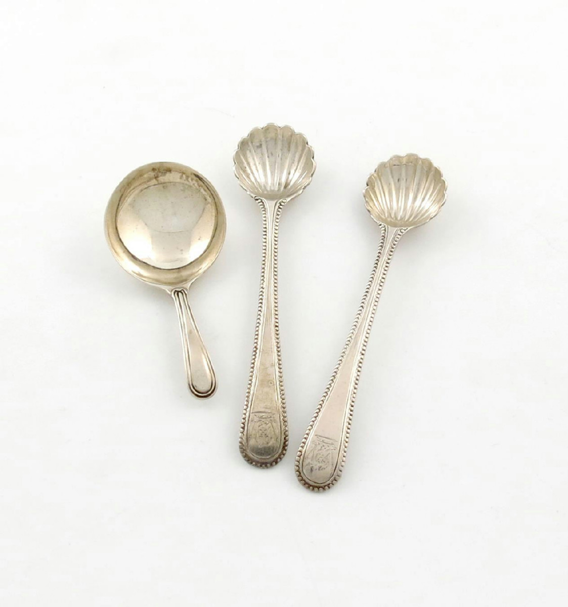 shell bowls, the terminals with a crest, plus a George III Thread pattern caddy spoon, by Smith and Fearn, London 1790, circular bowl, approx. total weight 1.5oz. (3)