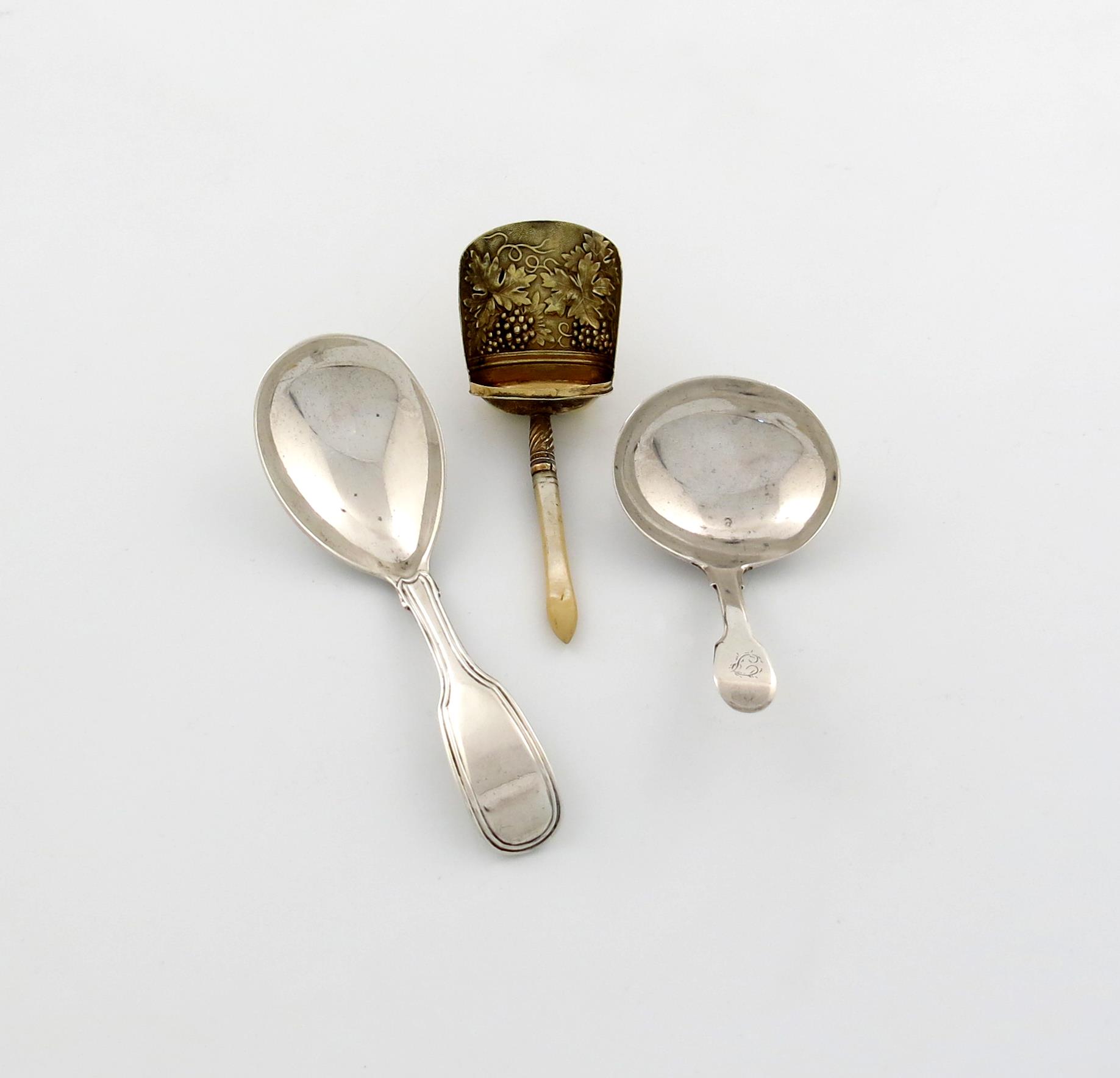 plus a silver-gilt caddy spoon, by Samuel Pemberton, shovel bowl embossed with grapevines, and another silver caddy spoon, London 1821. (3)