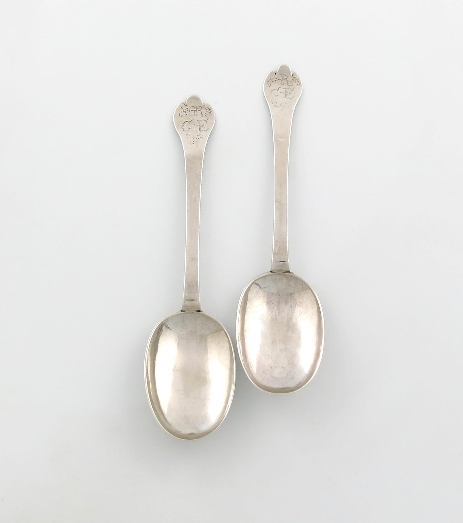 oval bowls with ribbed rat-tails, the terminals prick-dot initialled 'R' over 'GE', length 20cm and 19.7cm, approx. weight 3.6oz. (2)