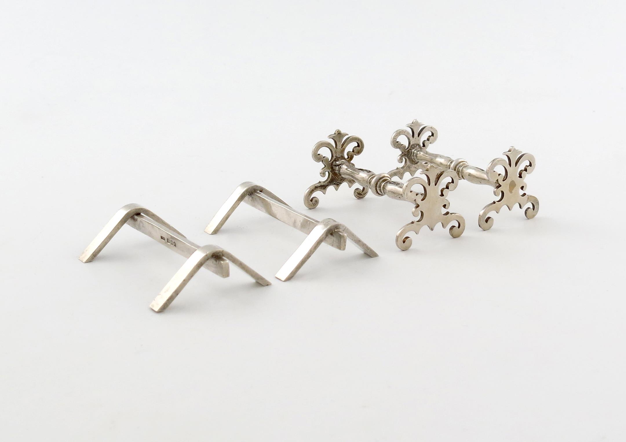 plain ingot form, plus a pair of modern silver knife rests, by Period Jewellery Manufacturing, Birmingham 1998, baluster form, pierced and scroll supports, length 6.8cm, approx. weight 4.5oz. (4)