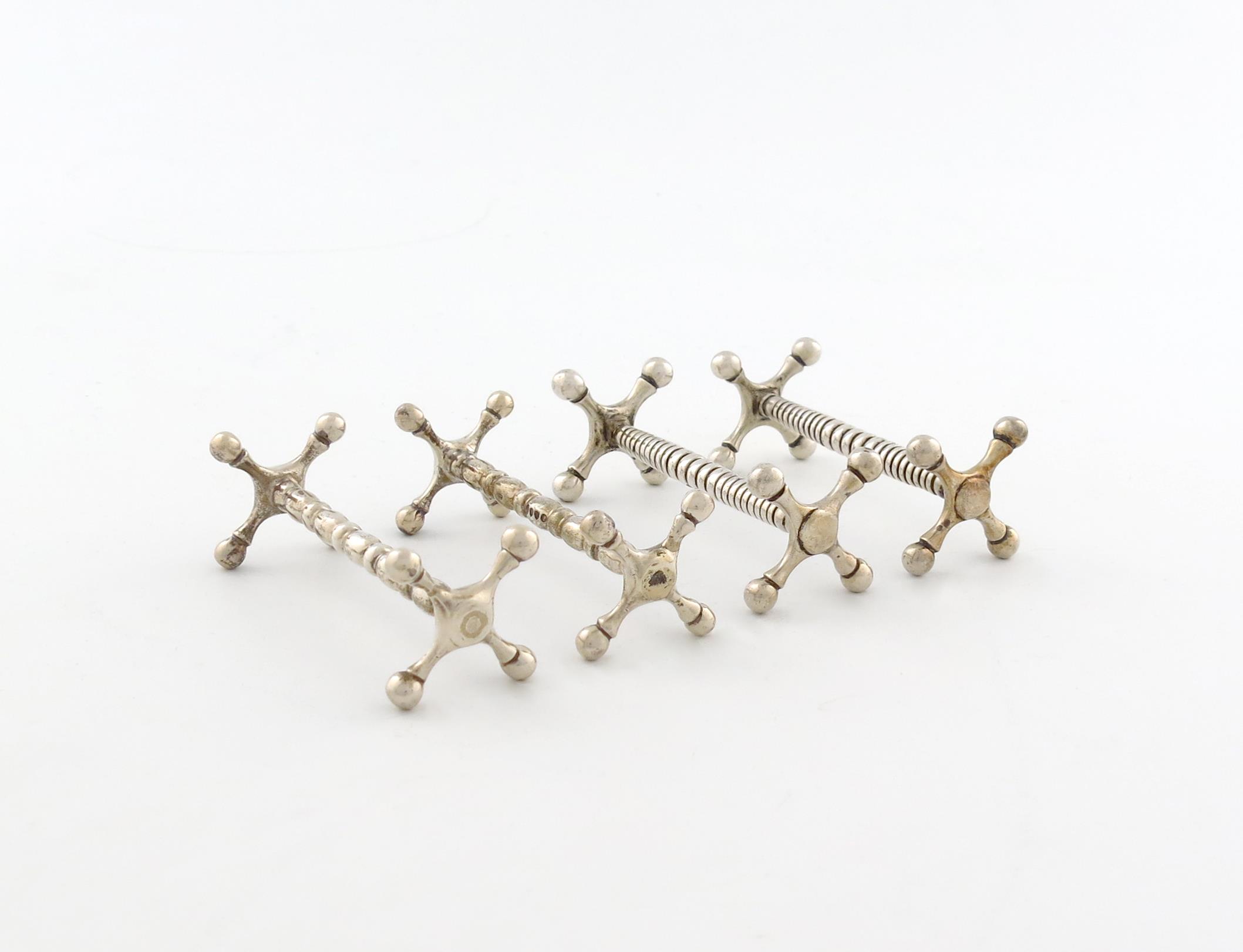 graduated fluted decoration, ball finials plus another pair of Victorian silver knife rests, by E. Hutton, London 1887, of knopped and baluster form, ball finials, length 8cm and 8.2cm, approx. total weight 6oz. (4)