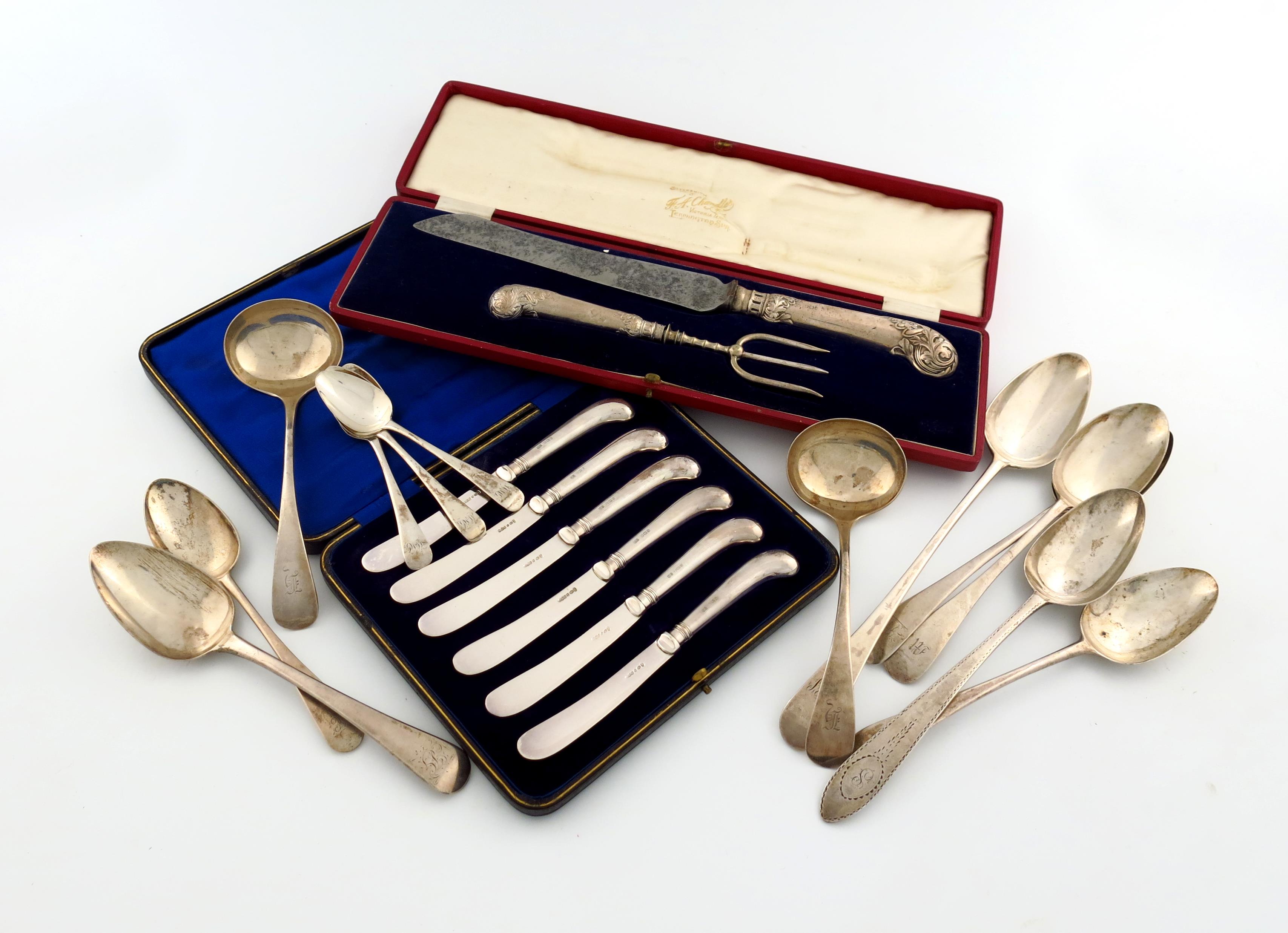 comprising a George III Irish bright-cut tablespoon, by John Pittar, Dublin 1787, a pair of sauce ladles, a George III basting spoon, four tablespoons, a dessert spoon, three teaspoons, a cased set of six silver-handled tea knives and a cased silver-handled bread knife and fork, approx. weighable 20oz. (qty)