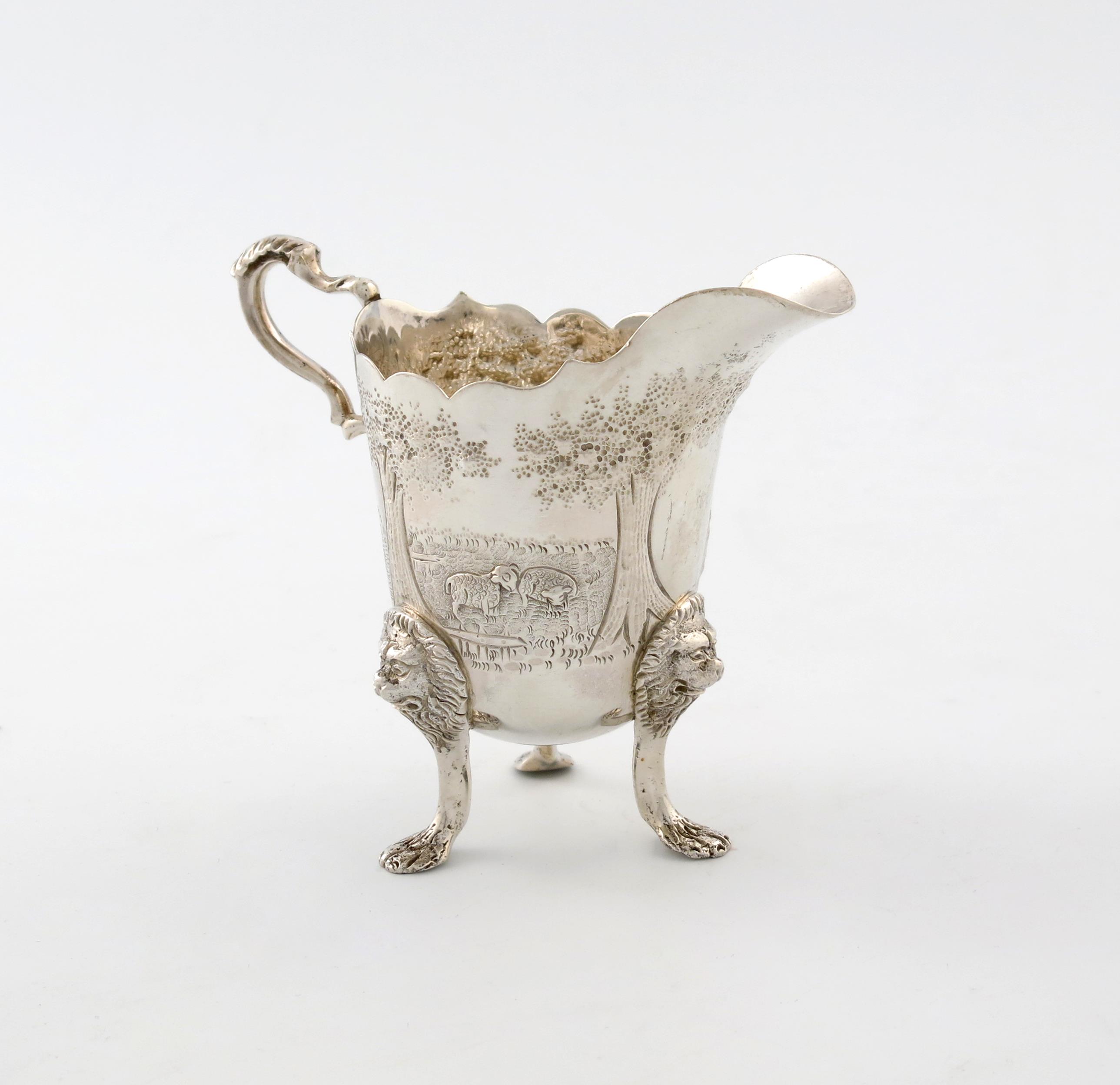 circular form, leaf capped scroll handle, embossed with animals, farm scenes and trees, on three lion mask paw feet, height 10.8cm, approx. weight 5.3oz.