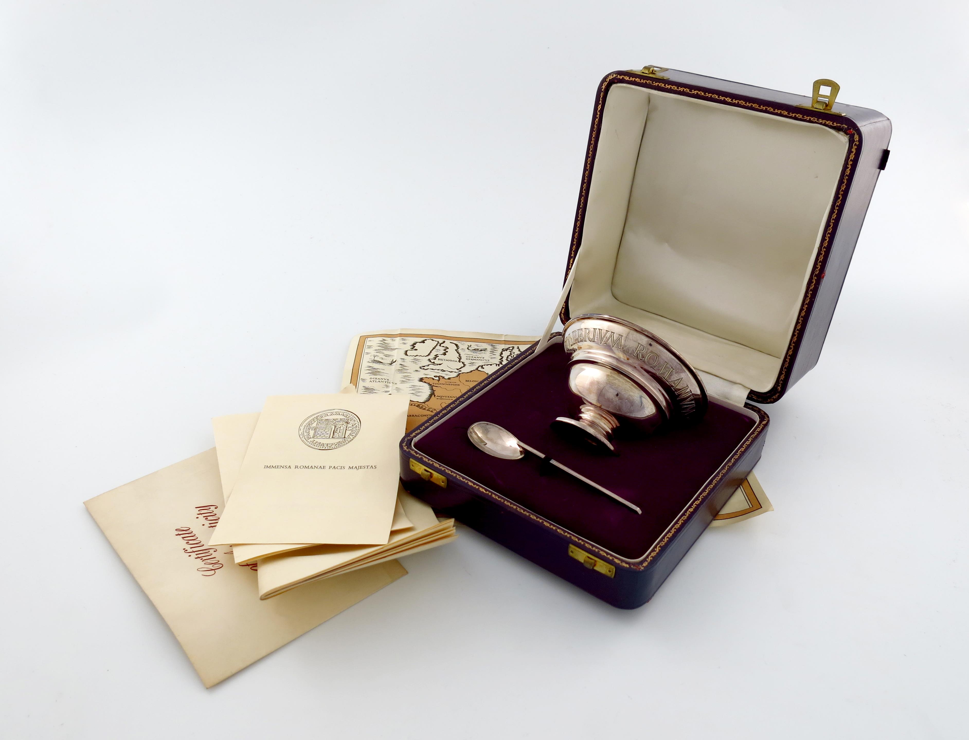 circular form, embosses 'IMPERIUM ROMANUM 29BC', on a spreading circular base, reproduced to commemorate the 2,000th anniversary of the birth of the Roman Empire, plus a matching Roman pattern spoon and certificates, in a fitted case, number 157 of 1500, approx. weight 6.5oz.