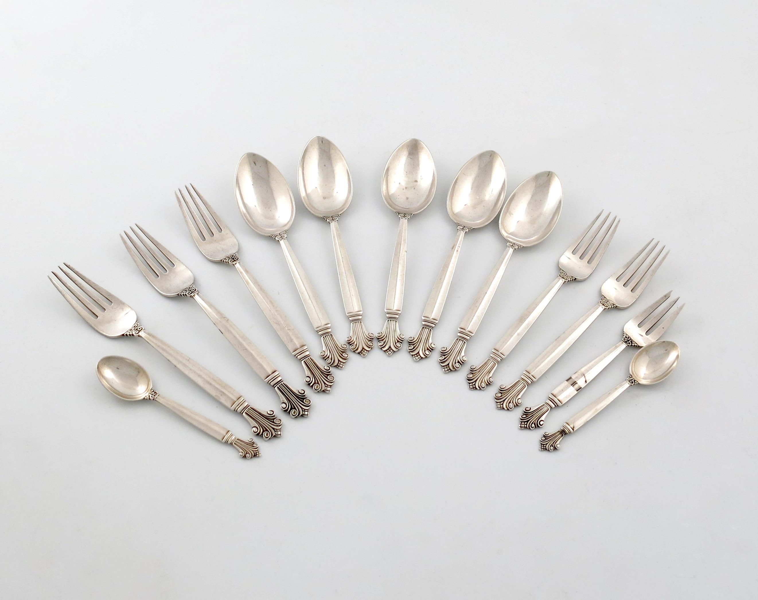 Designed by Johan Rohde for Georg Jensen, a collection Danish silver Acanthus pattern flatware,