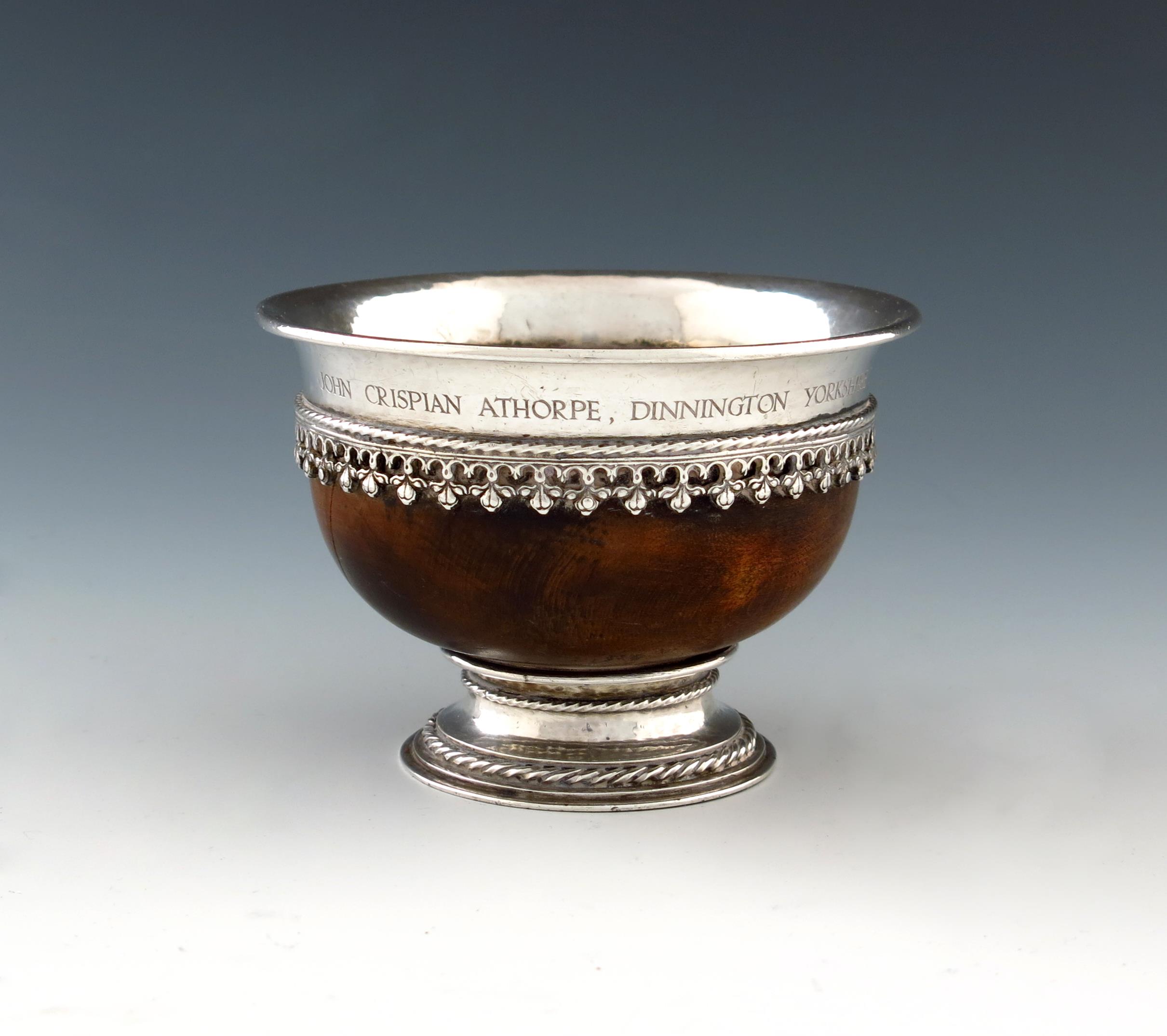 By Omar Ramsden, a silver-mounted Arts and Crafts mazer bowl,