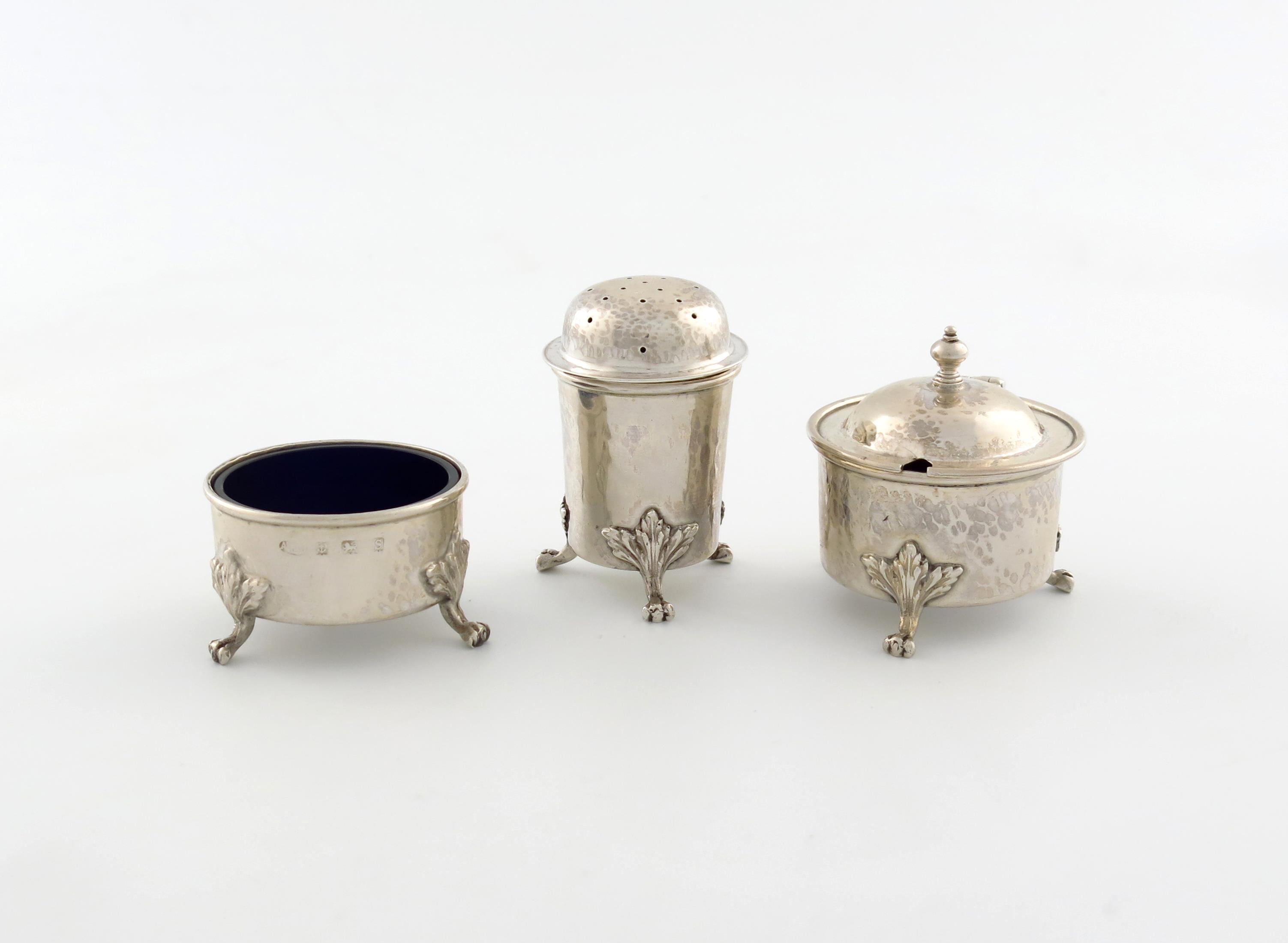 By A.E Jones, a three-piece silver Arts and Crafts condiment set,