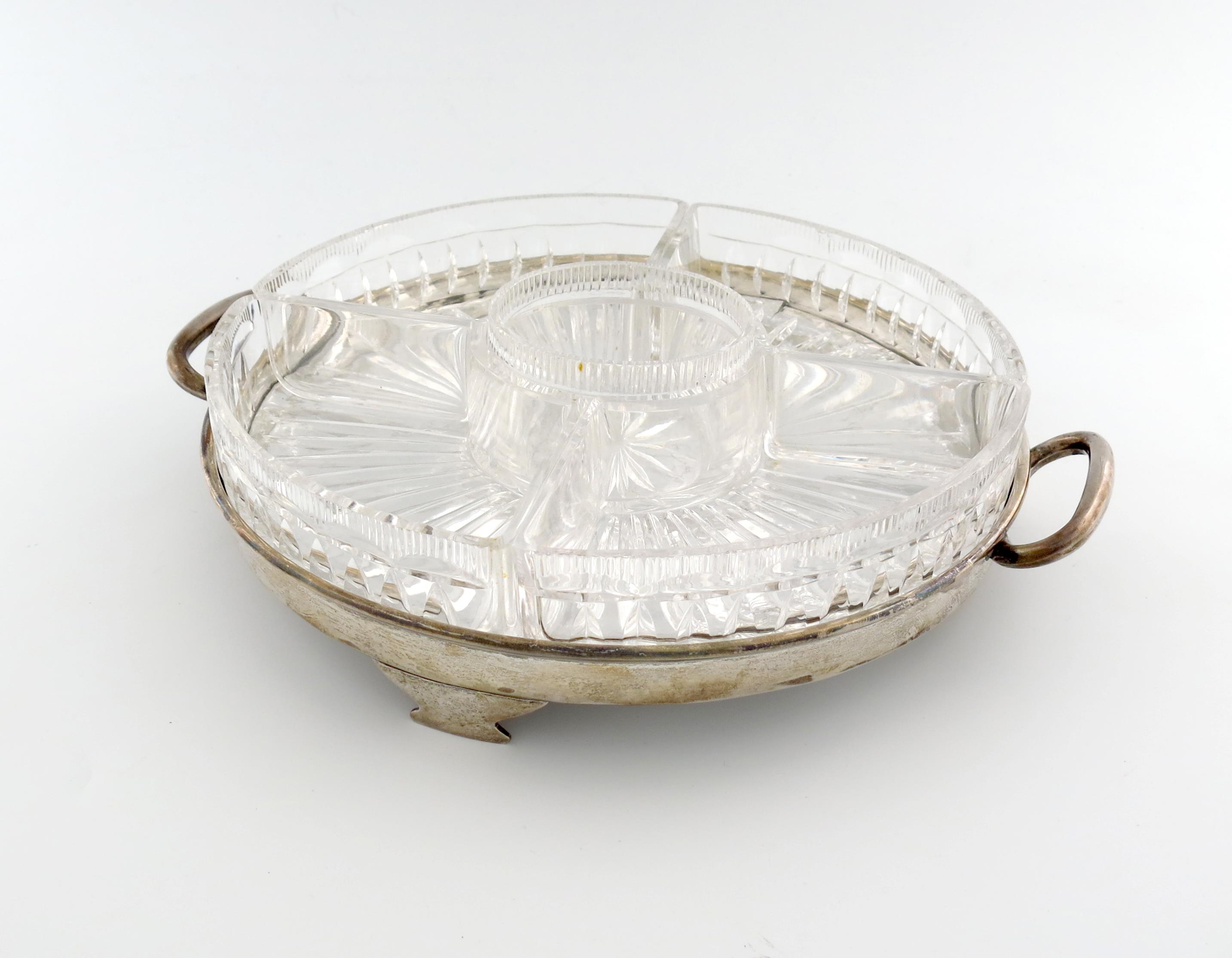 of circular form, scroll handles, on three bracket feet, lacking mirrored base, the centre with five cut glass dishes, length handle to handle 33.4cm, approx. weight 12.5oz.