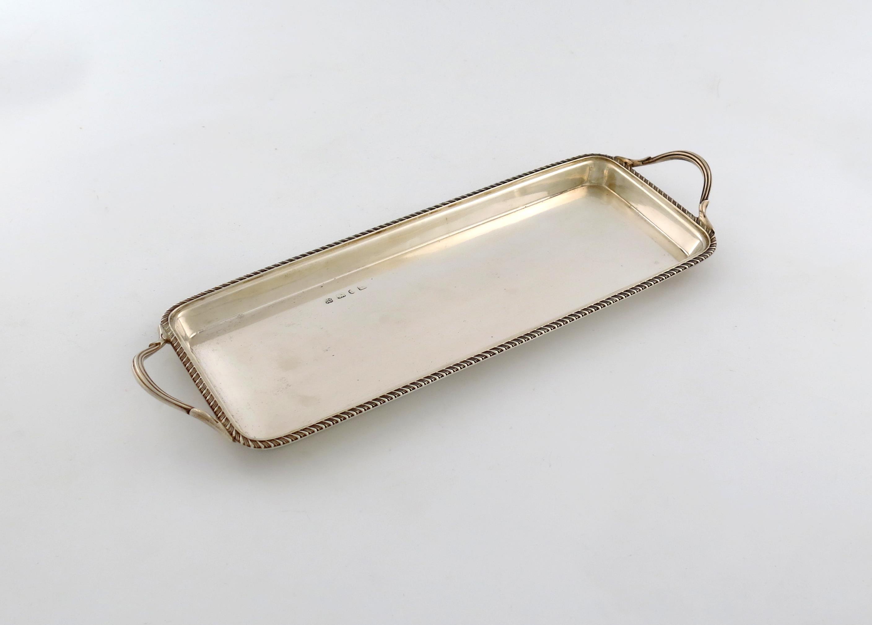 rectangular form, reeded scroll handles, gadroon borders, length handle to handle 37.5cm, approx. weight 13.6oz.