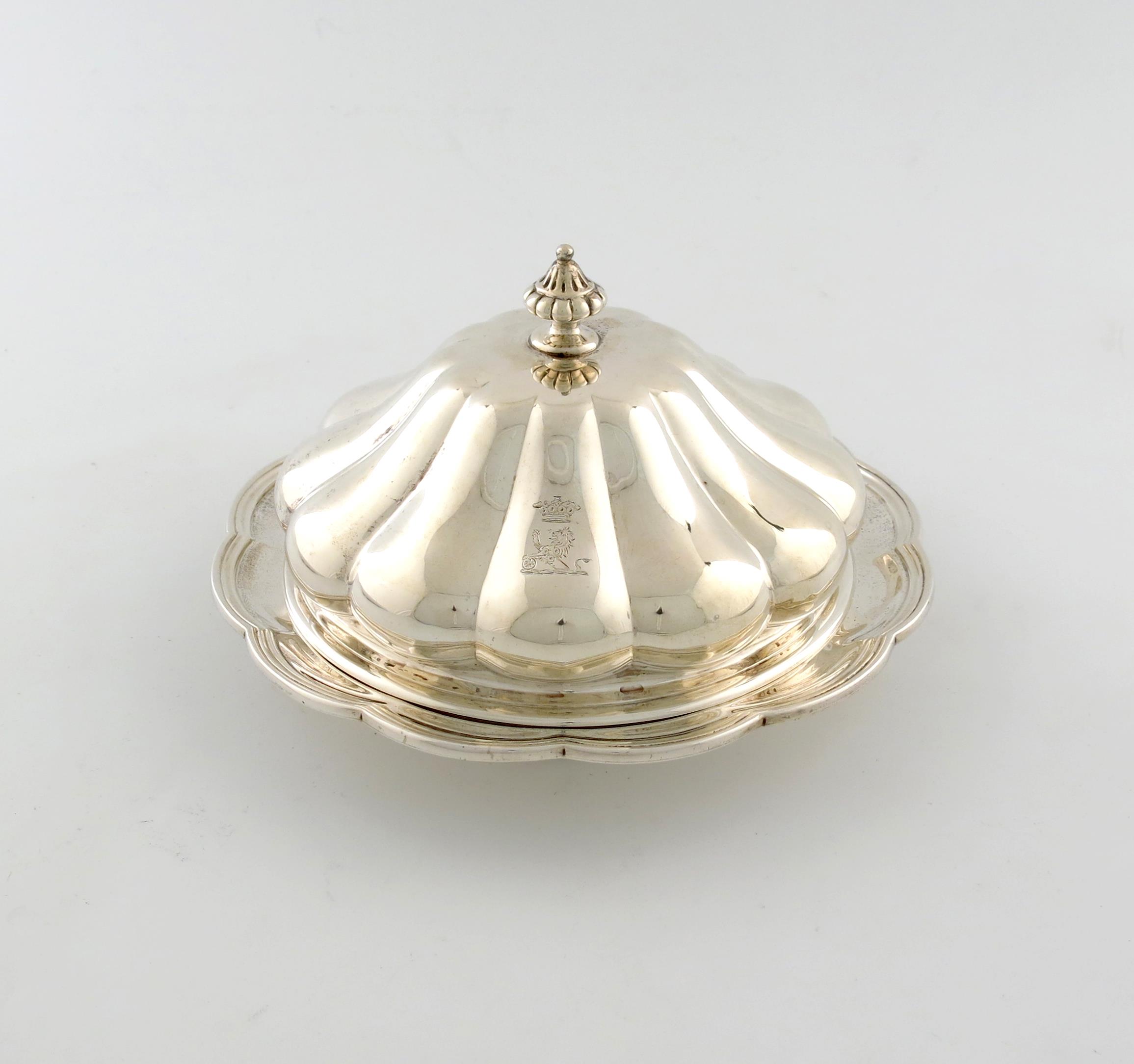 circular fluted form, the domed cover with a fluted finial, engraved with a crest, diameter 21.2cm, approx. weight 24.9oz.