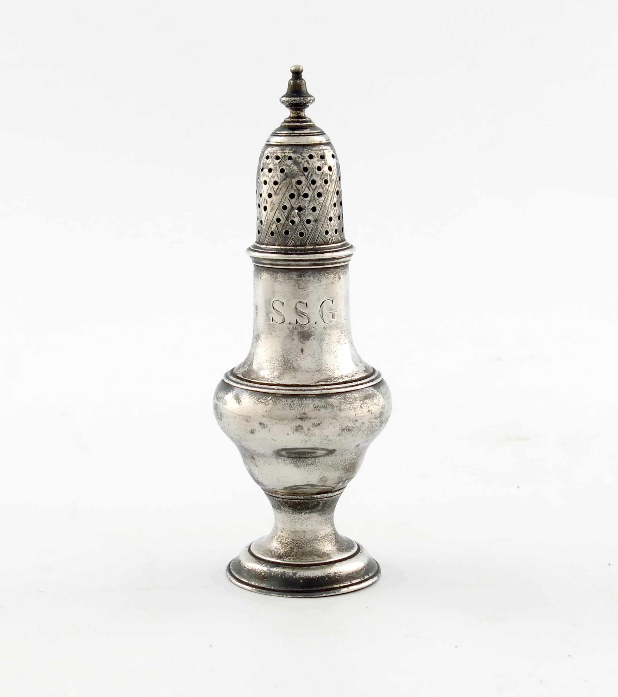 baluster form, pull-off cover with a knop finial, on a circular foot, height 15cm, approx. weight 3.5oz.