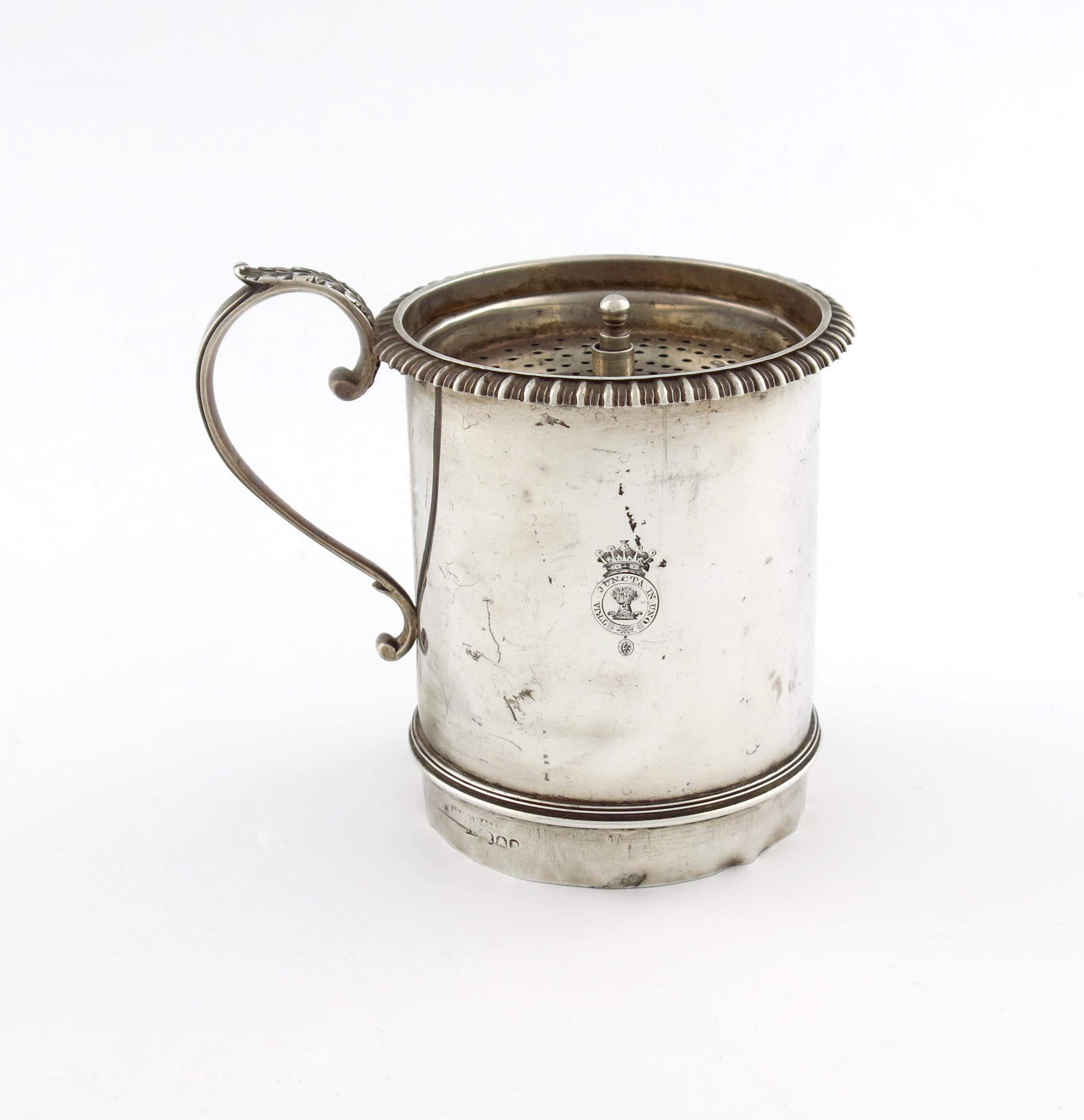 cylindrical form, gadroon border, leaf capped scroll handle, engraved with a cipher, height 12.5cm, approx. weight 11.8oz.
