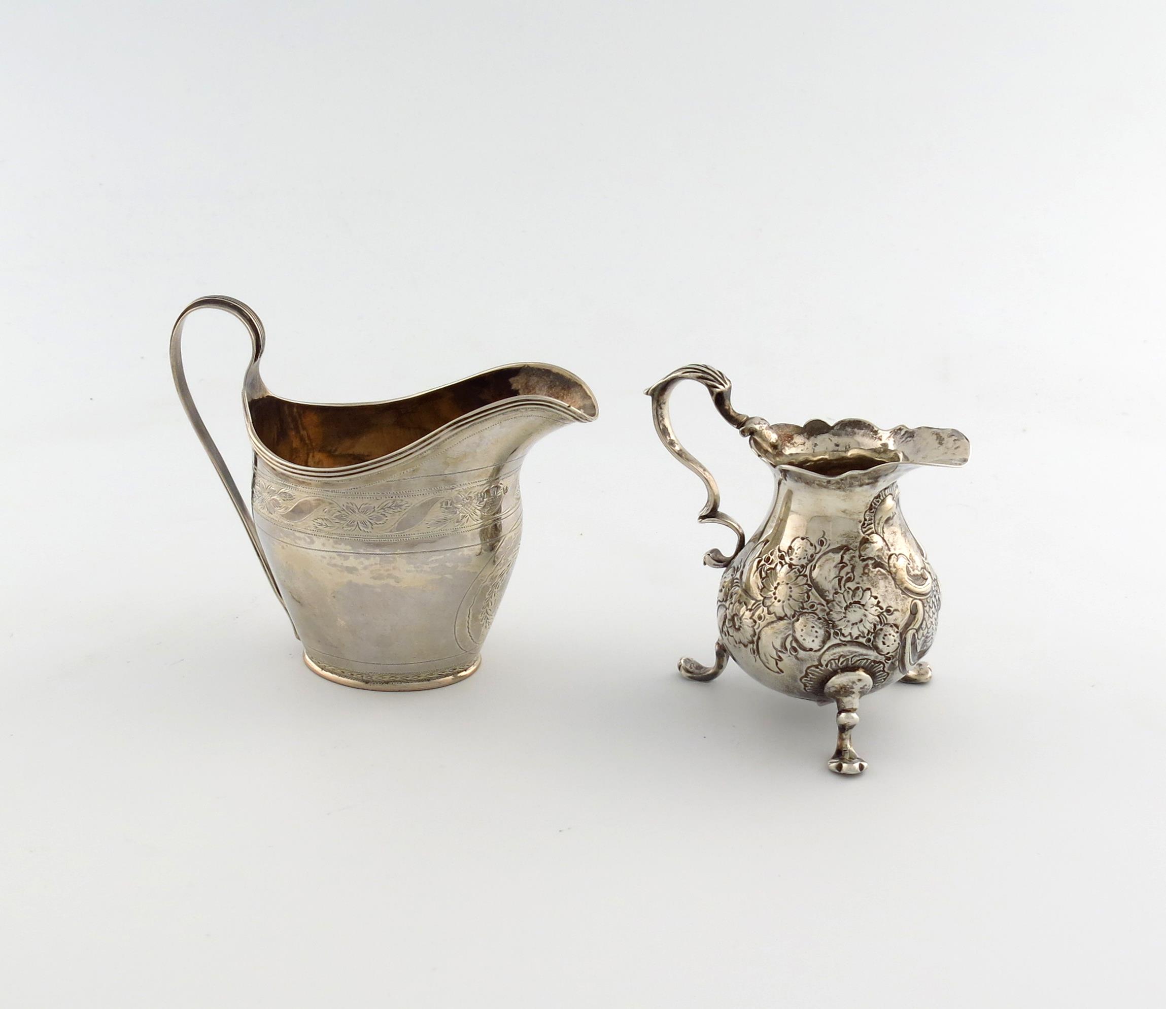 oval form, scroll handle, engraved decoration, plus a George II silver cream jug, of bluster form, embossed foliate decoration, London 1743, approx. total weight 6.5oz. (2)