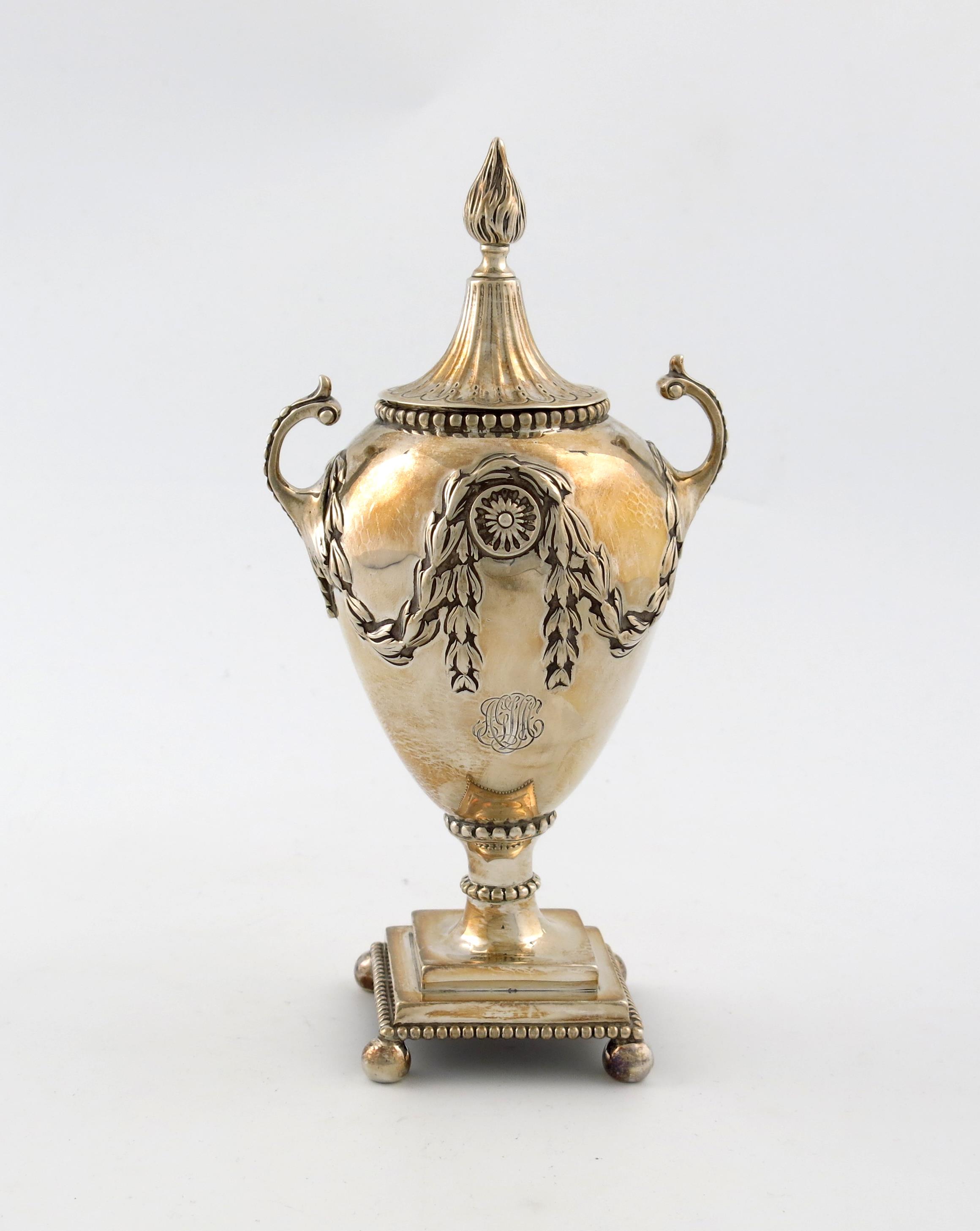 modelled as a George II sugar vase, scroll handles, swag and medallion decoration, the pull-off cover opens to reveal a pierced foliate inner cover, on a square base on four ball feet, initialled, height 21.5cm, approx. weight 11.5oz.