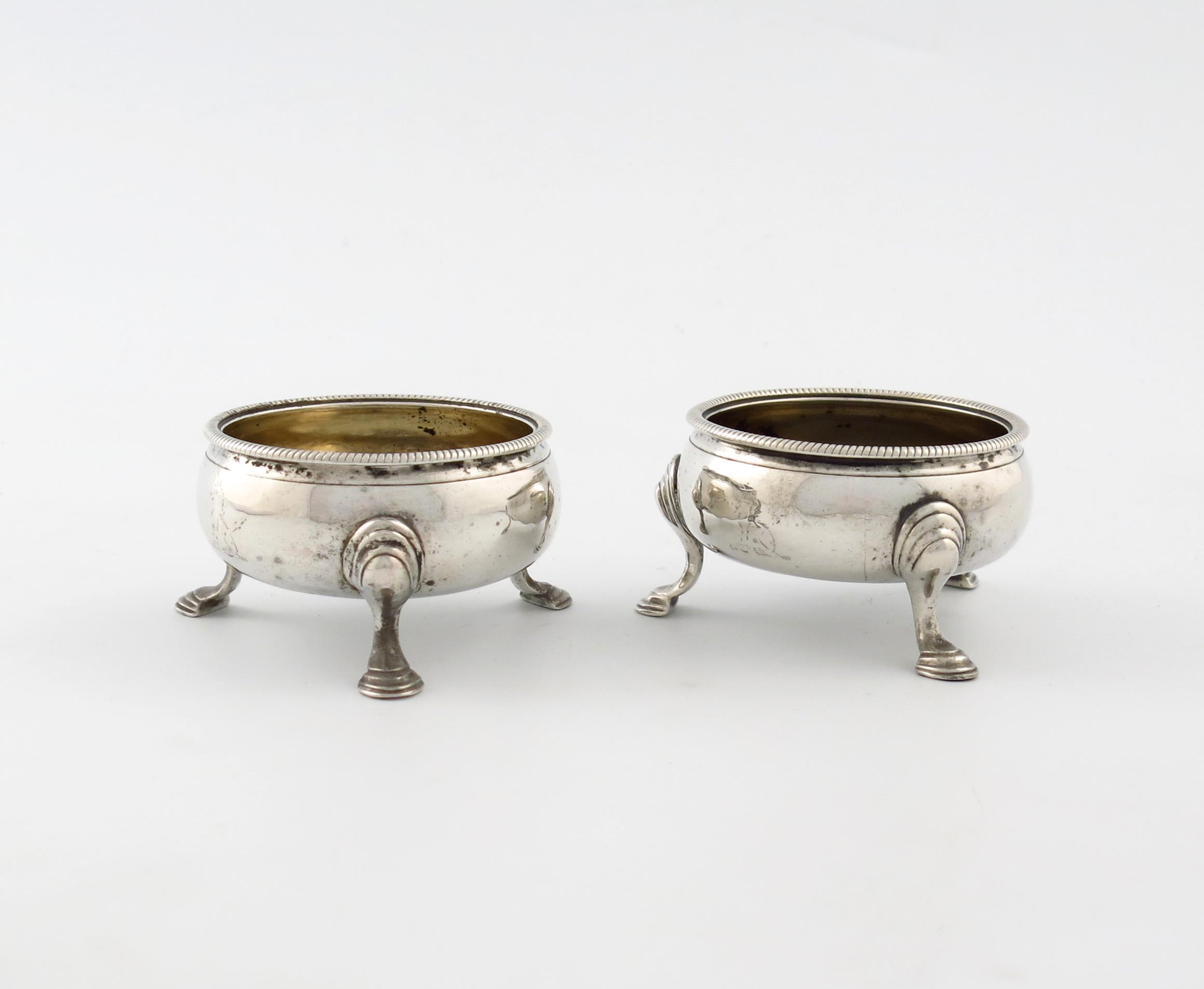 circular cauldron form, rope-work borders, on three hoof feet, the bowls with traces of gilding, with a worn crest, diameter 7cm, approx. weight 5.9oz. (2)