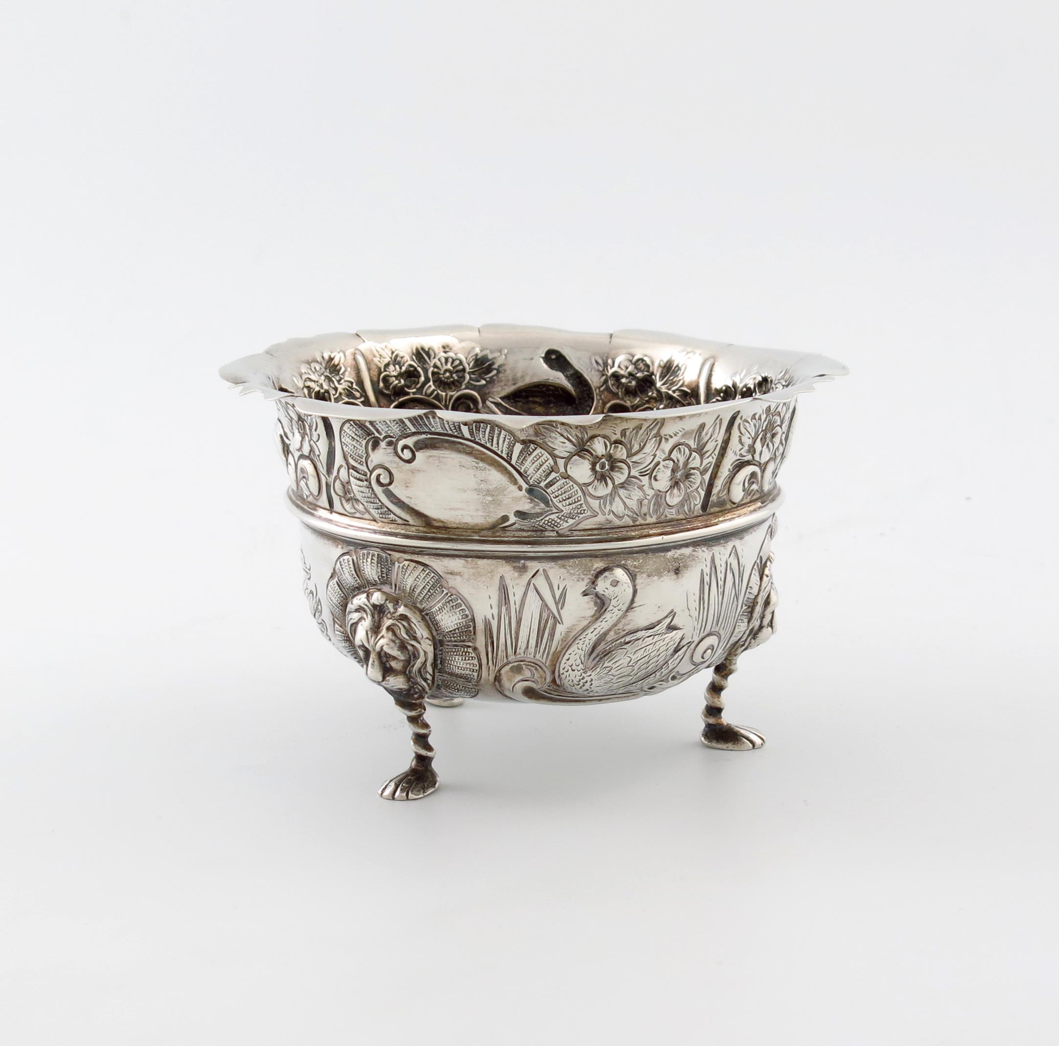 circular form, embossed with animals and foliate scroll decoration in the Irish manner, on three lion mask capped paw feet, diameter 13.5cm, approx. weight 7oz.