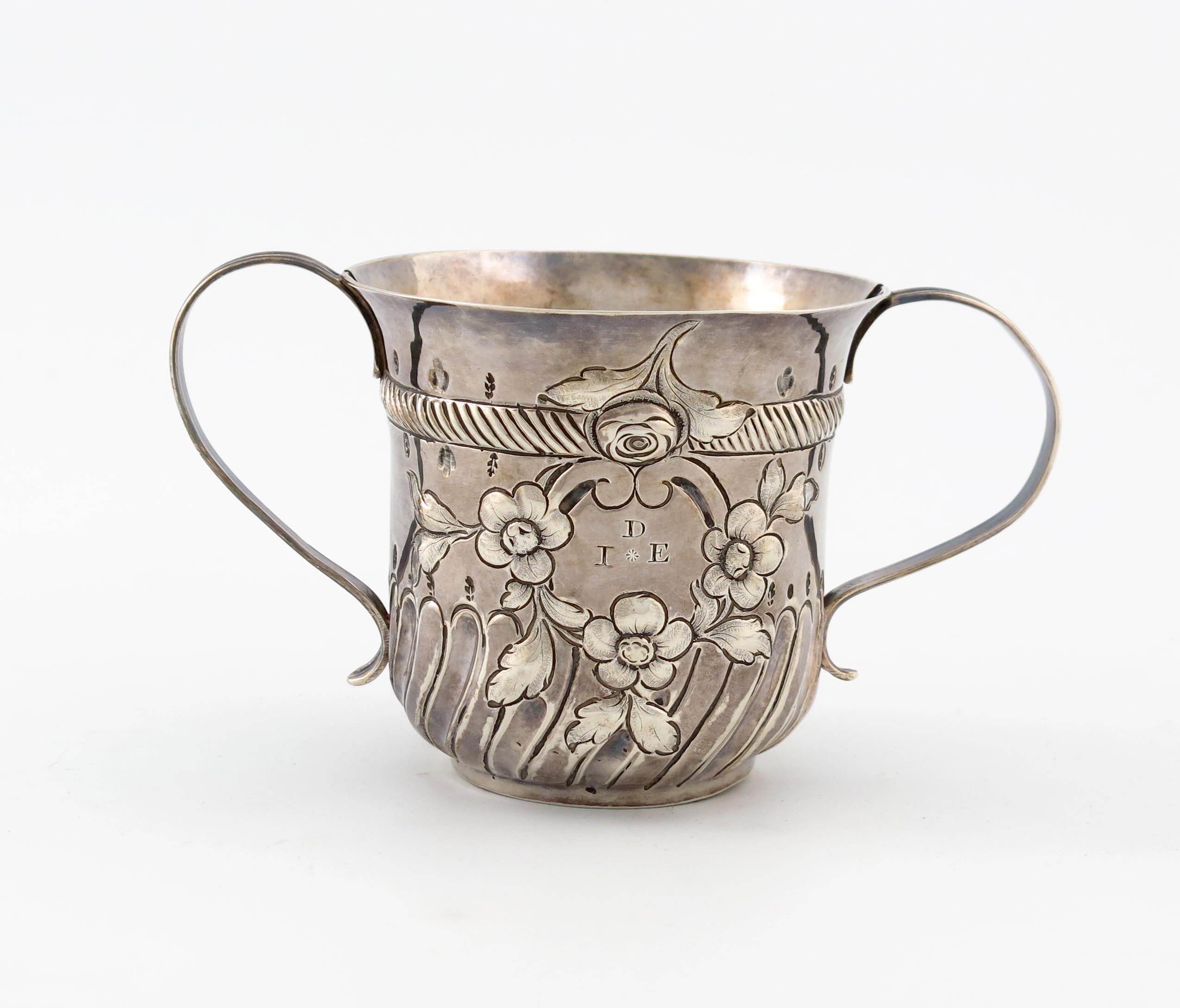 circular form, part-fluted decoration, fluted scroll handles, embossed foliate decoration and with a rope-work girdle, initialled, height 9cm, approx. weight 5oz.