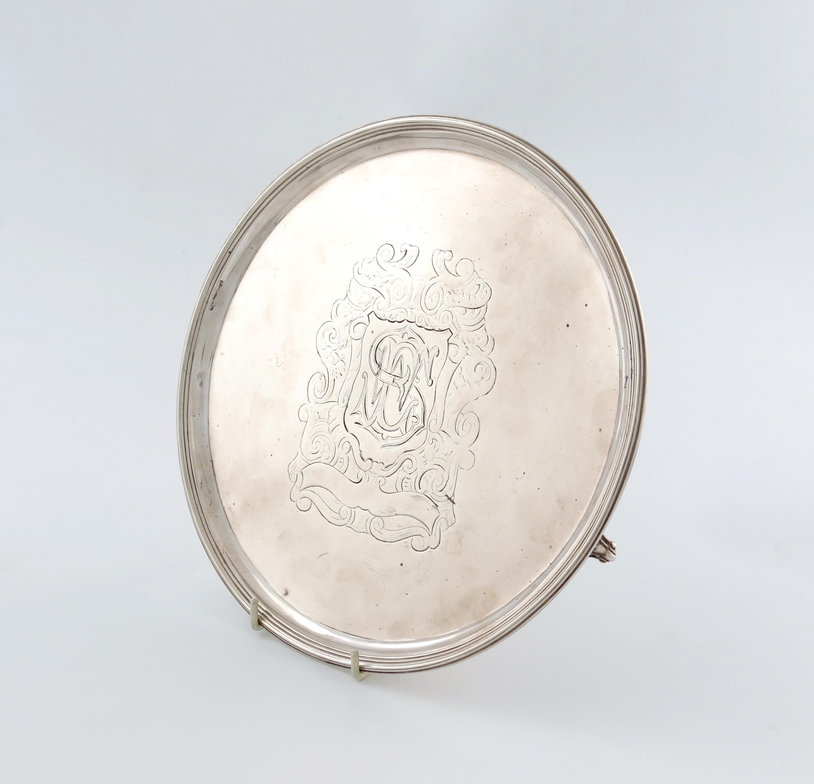 circular form, reeded border, the centre with a later monogram within foliate mantling, on three bracket feet, diameter 25.8cm, approx. weight 17.4oz.