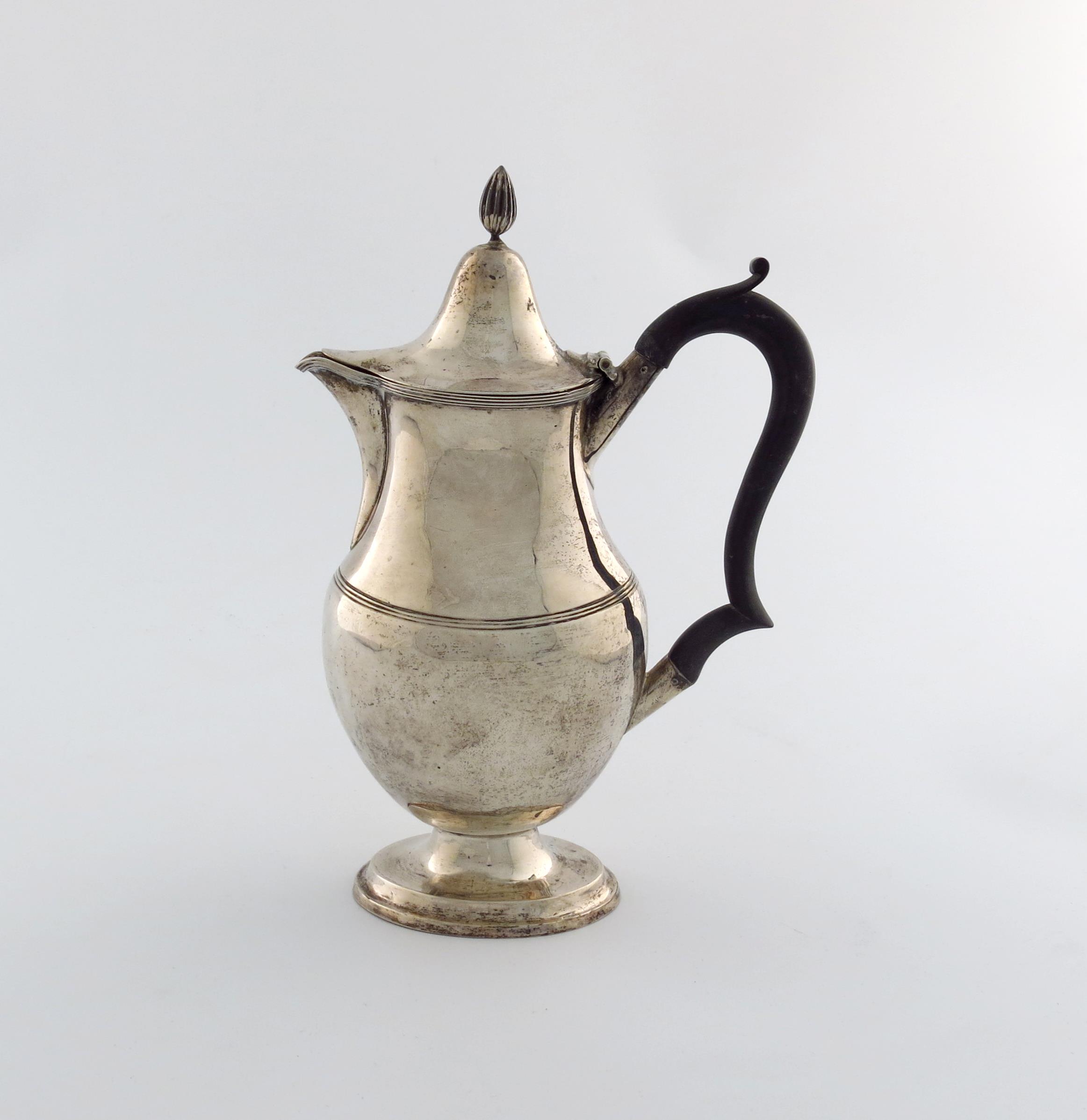 oval tapering form, domed hinged cover, reeded girdle, engraved with an initial, on a raised circular foot, height 25cm, approx. weight 12.5oz.