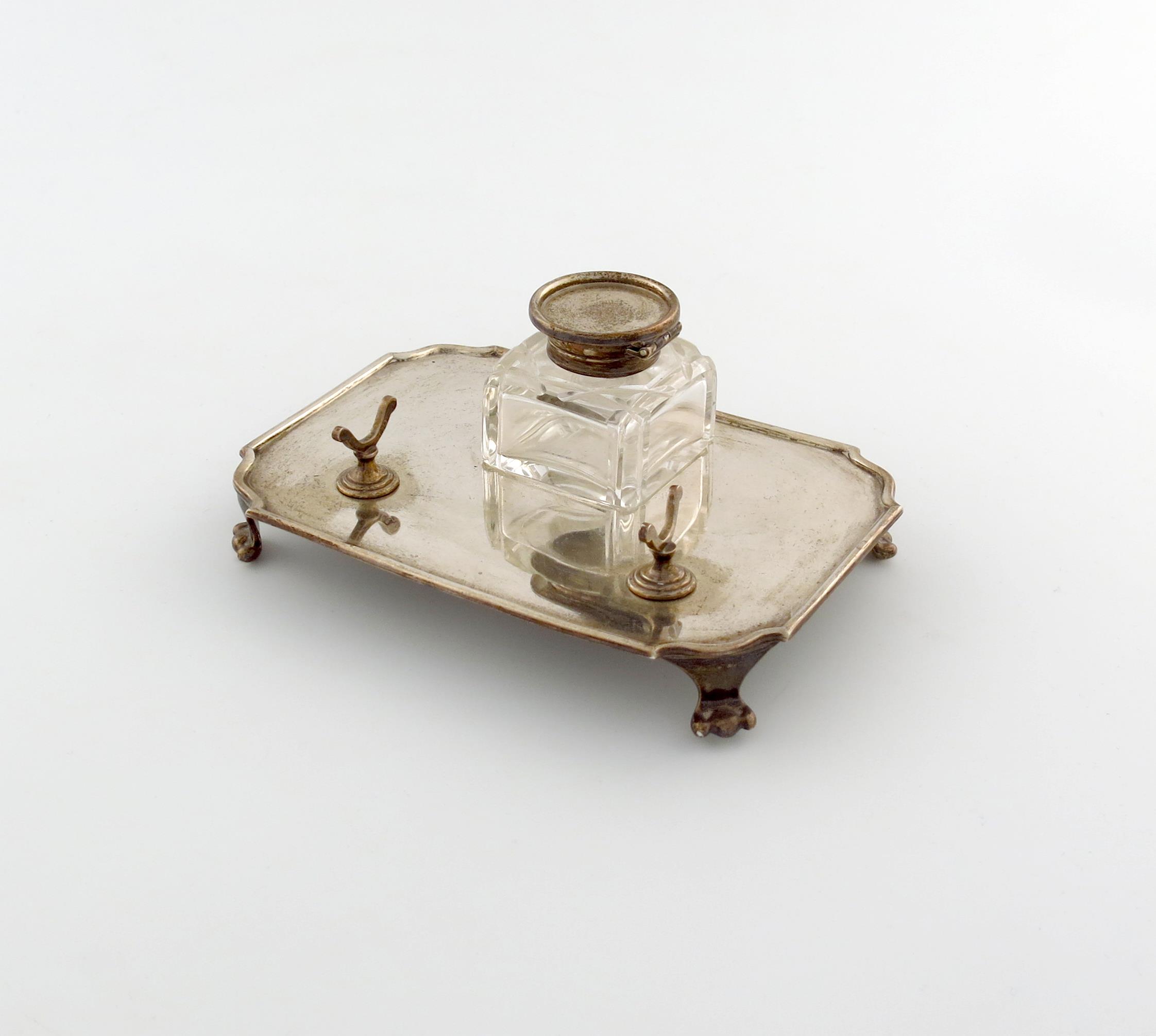 rectangular form, canted corners, moulded border, on four bracket feet, with a pen holder and silver-mounted glass inkwell, length 17.3cm, approx. weight 8.4oz.