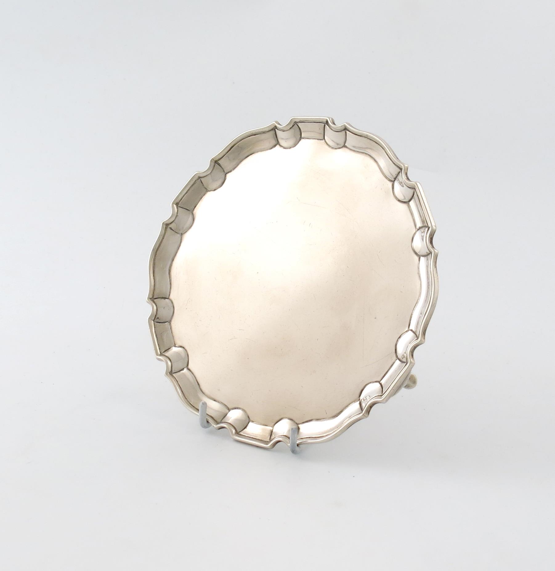 circular form, moulded border, on three scroll feet, diameter 17.7cm, approx. weight 8.9oz.