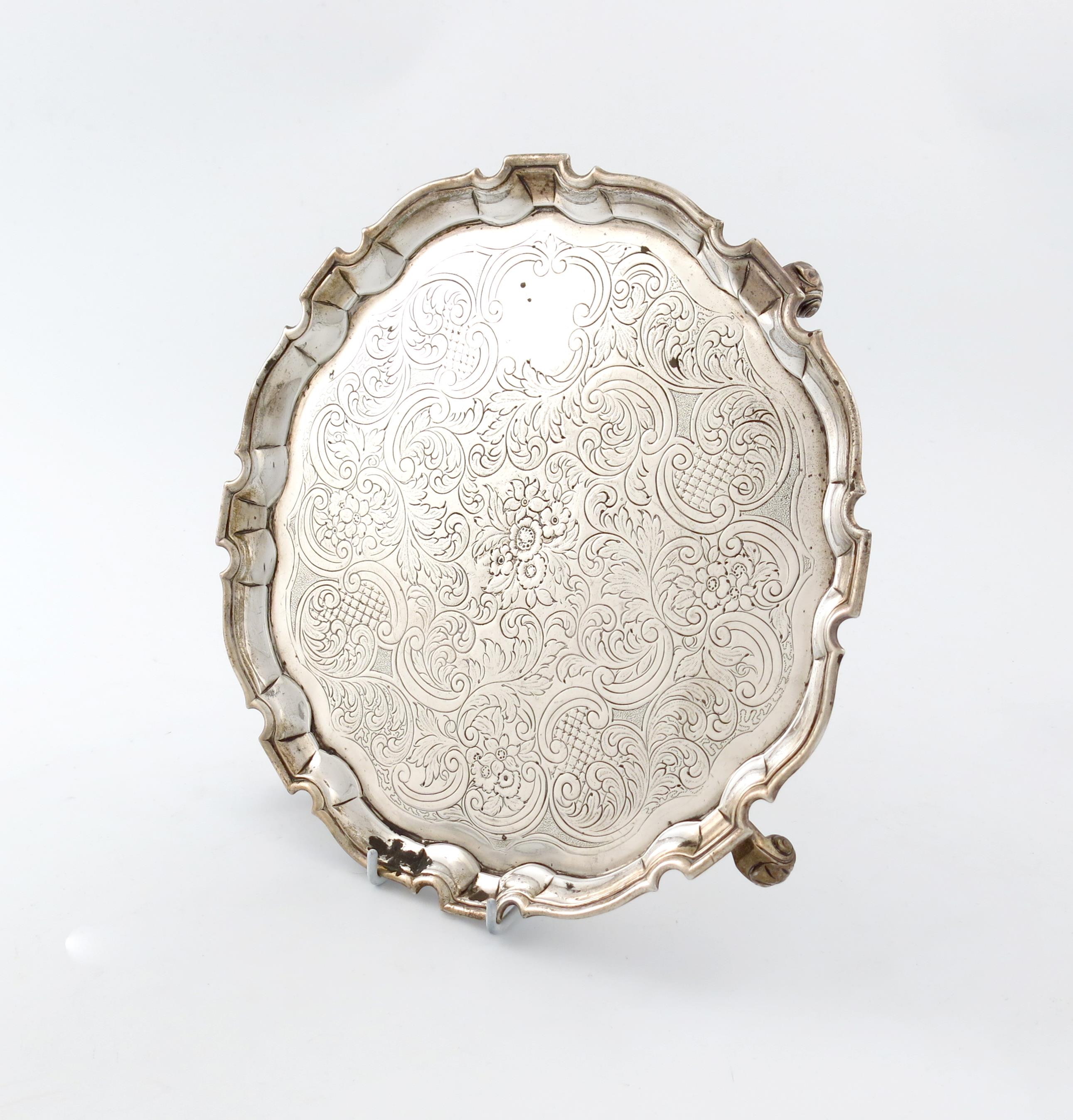 circular form, moulded border, the centre with later chased foliate scroll decoration, on four gnarl feet, diameter 27.5cm, approx. weight 22.5oz.