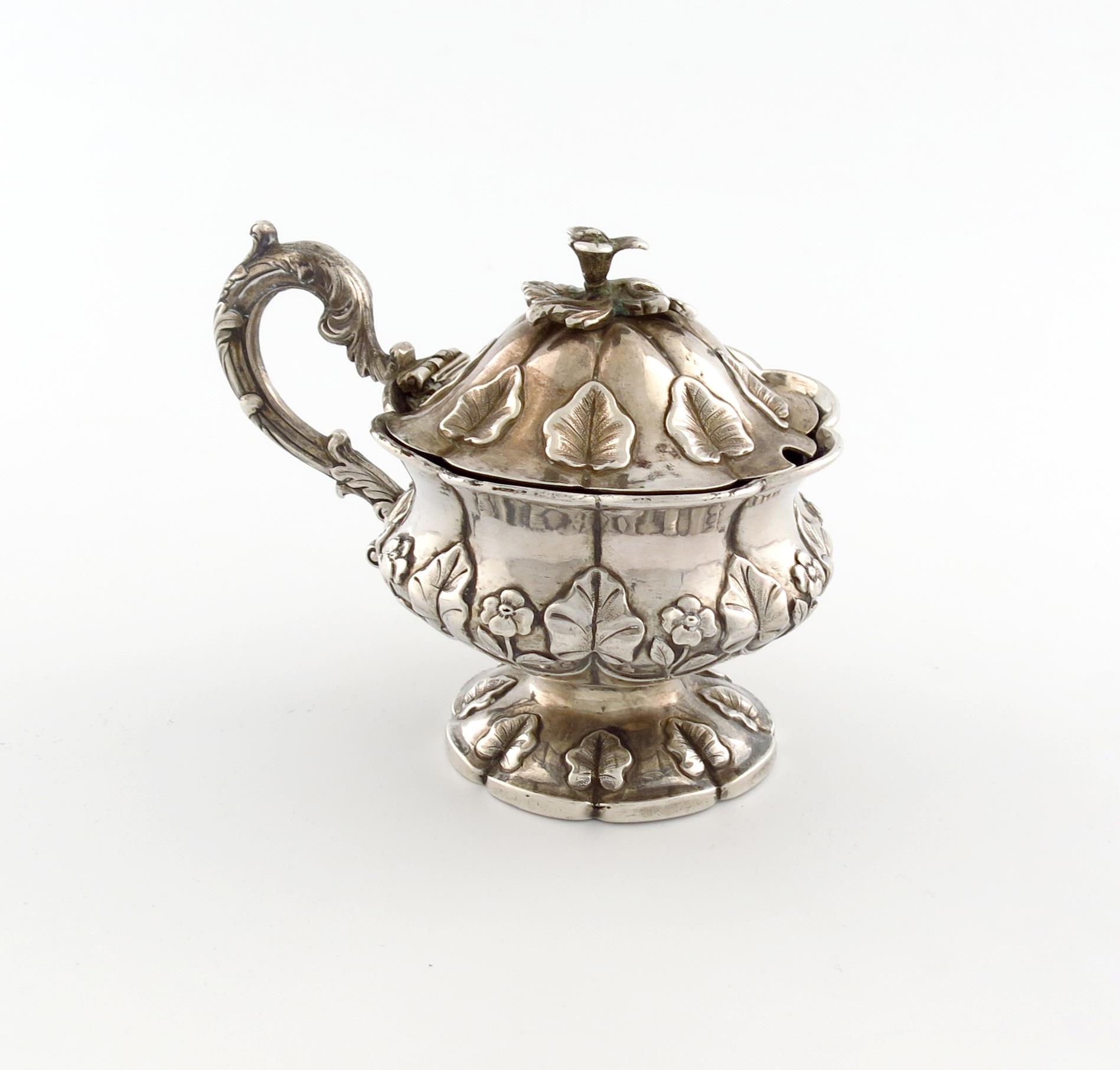 lobed circular form, the hinged cover with leaves and a foliate finial, scroll handle, on a raised circular foot, height 9cm, approx. weight 6oz.