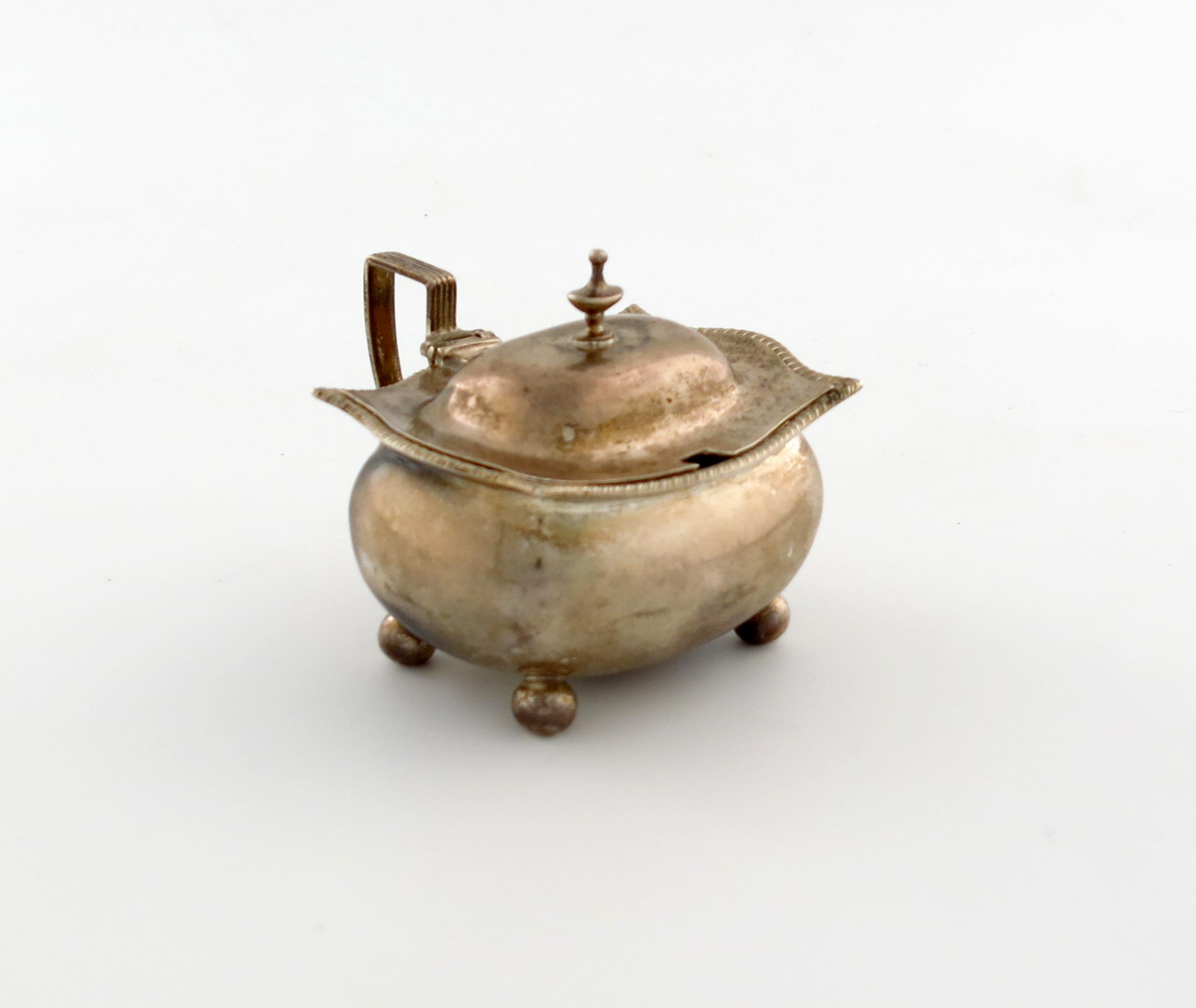 oblong bellied form, reeded scroll handle, gadroon border, domed cover with an urn finial, on four ball feet, length 8.5cm, approx. weight 4.5oz.