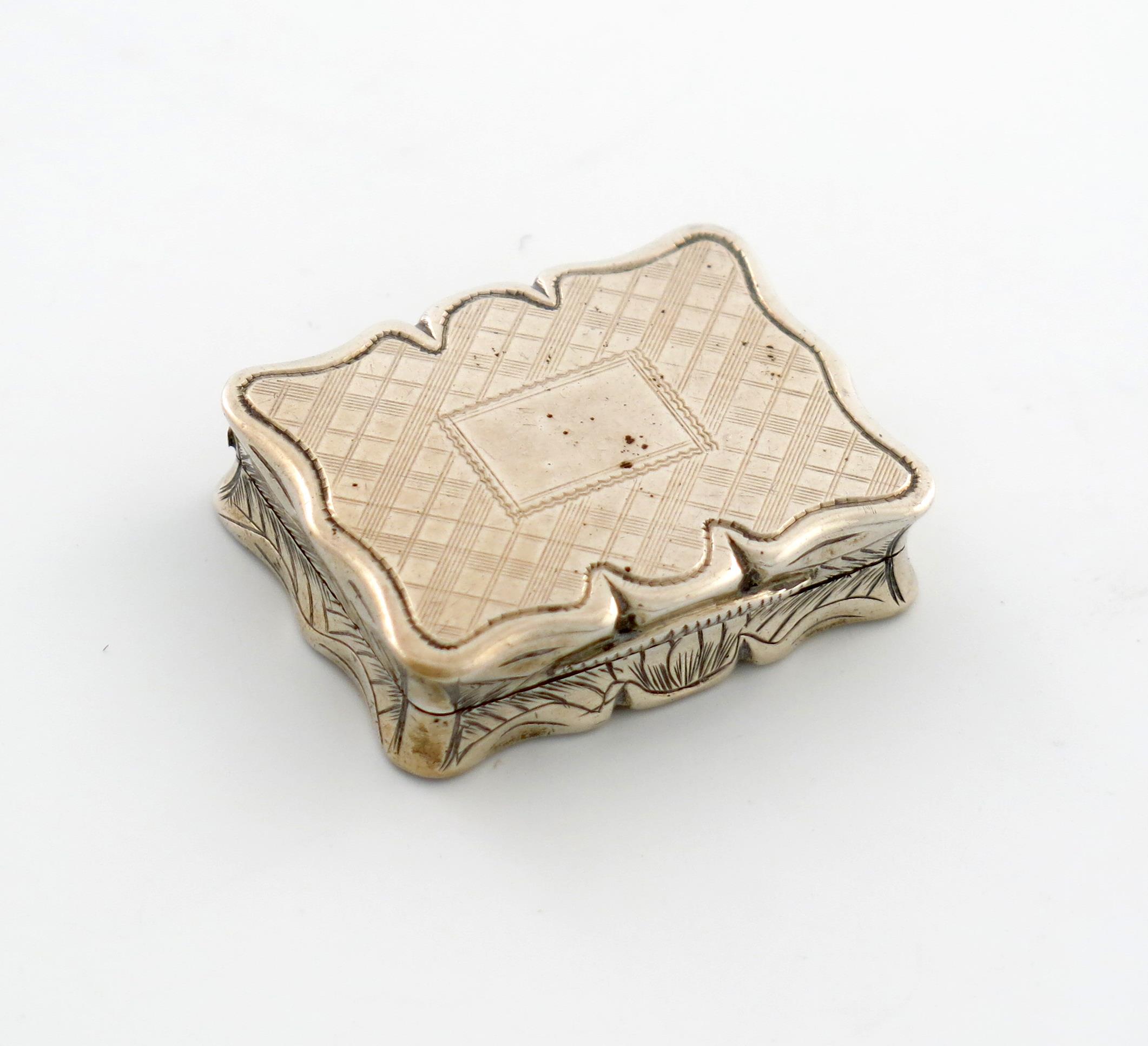 shaped rectangular form, engraved tartan decoration, the hinged cover with a vacant cartouche, the interior with a hinged pierced foliate scroll grille, length 3.5cm, approx. weight 0.6oz.