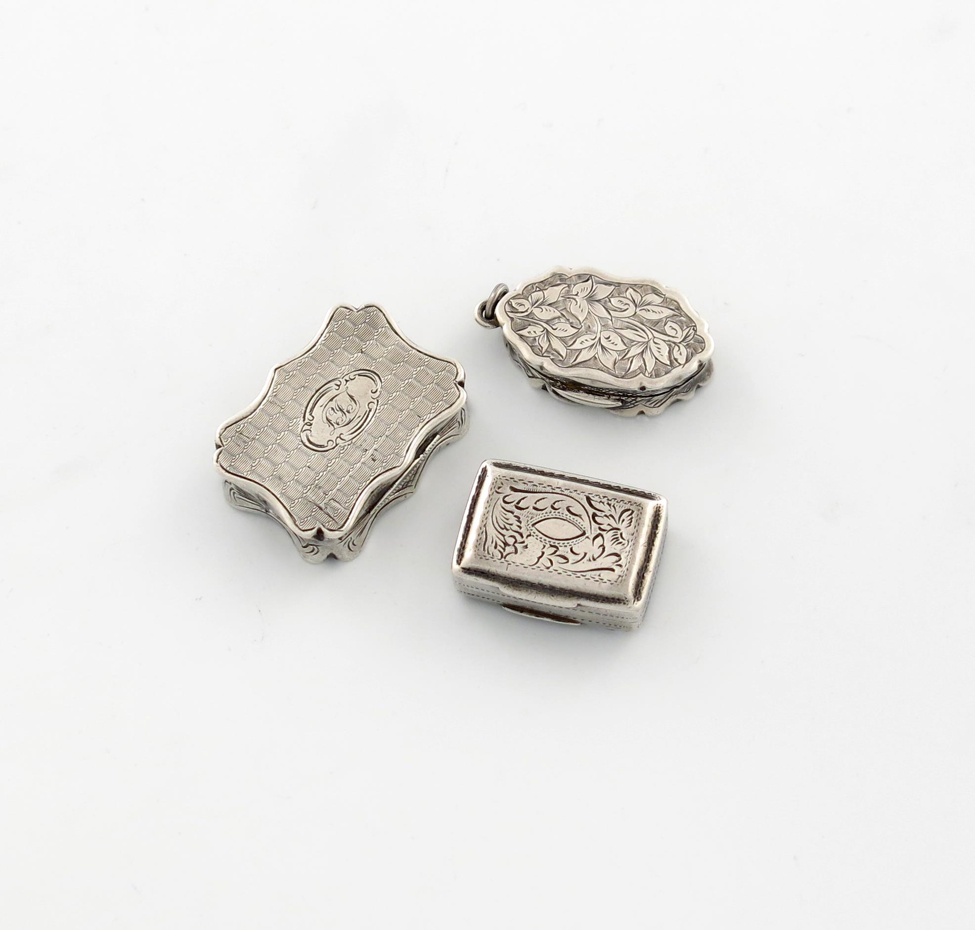comprising: one of shaped oval form, by George Unite, Birmingham 1880, engraved foliate decoration, length 3cm, plus one by Nathaniel Mills, Birmingham 1858, rectangular form, engine-turned decoration, and a rectangular form by John Bettridge, Birmingham 1824, approx. total weight 1.2oz. (3)