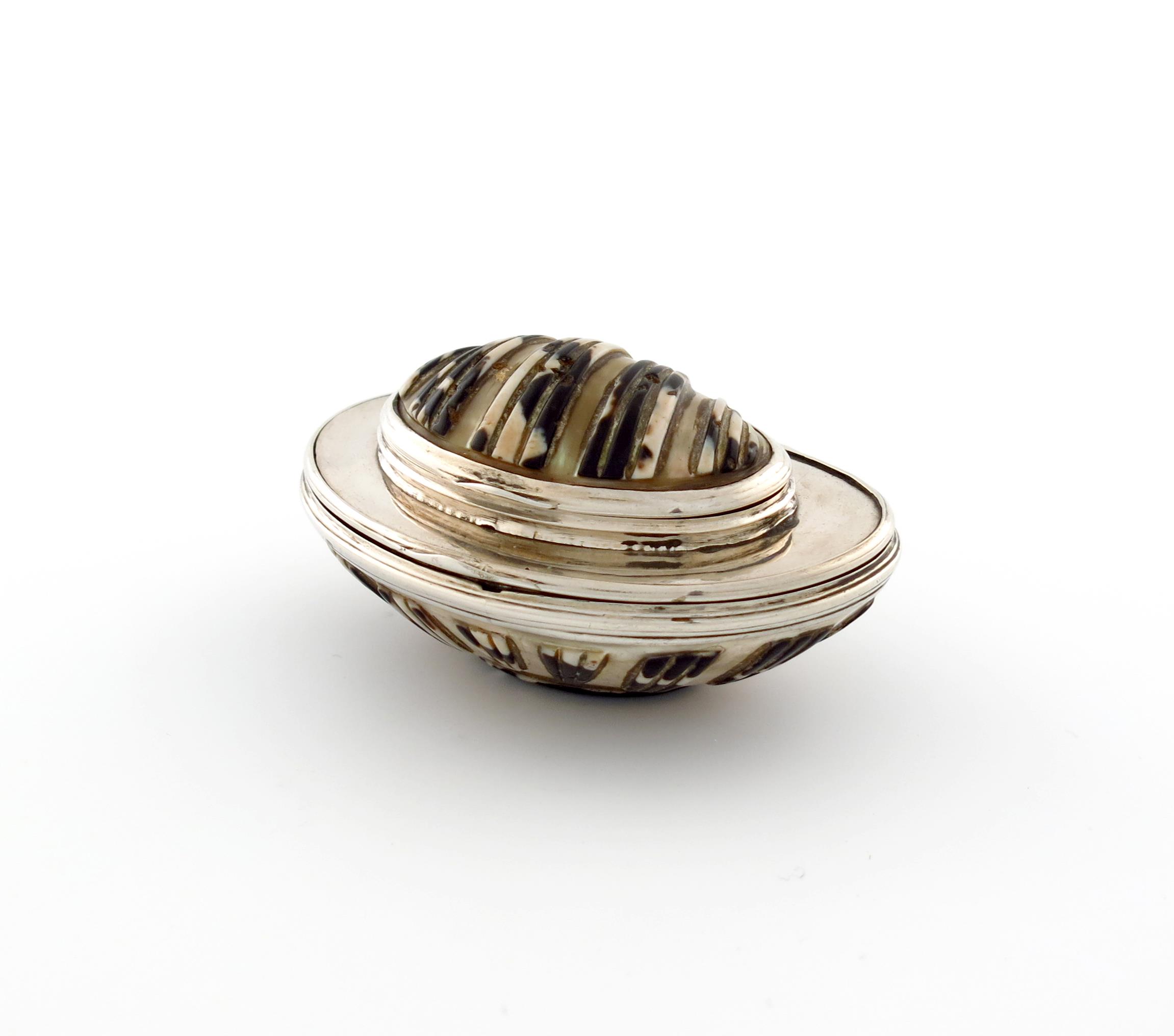 oval form, plain mounts, the hinged cover with a smaller silver mounted box, length 7.5cm.