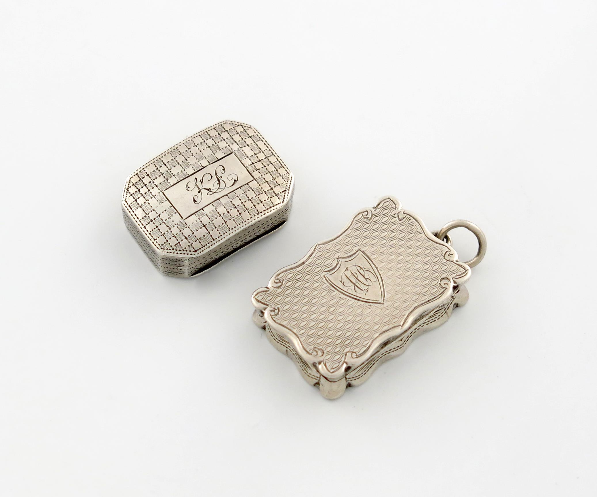 rectangular form, engine-turned decoration, pierced foliate scroll decoration, shield cartouche, with a ring attachment, plus a George III silver vinaigrette, by Samuel Pemberton, Birmingham 1811, shaped rectangular form, approx. total weight 0.6oz. (2)