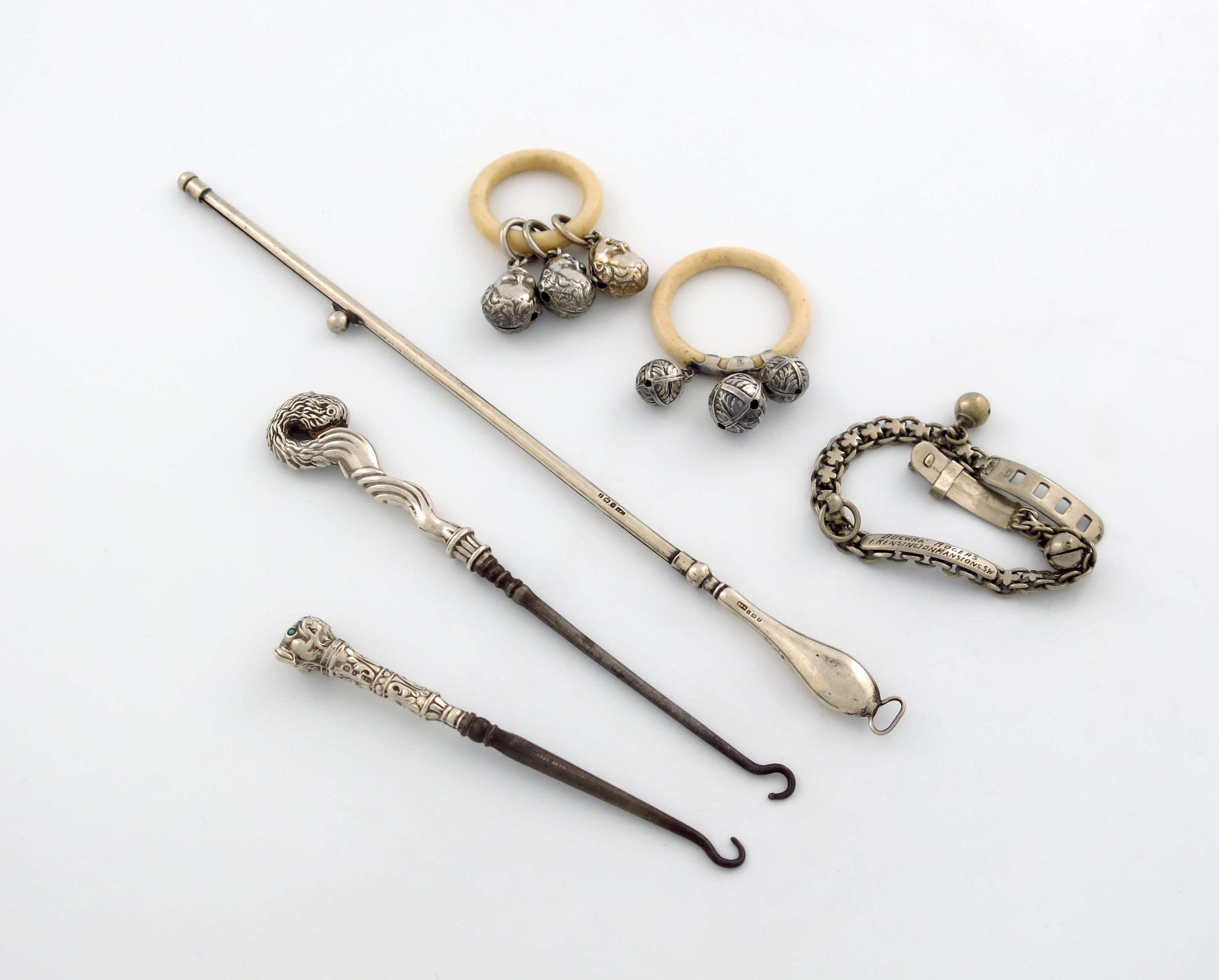comprising: two novelty silver-handled button hooks, one with a pug dog, the other a bird's head, plus two baby's rattles, a taper holder and an electroplated collar. (6)