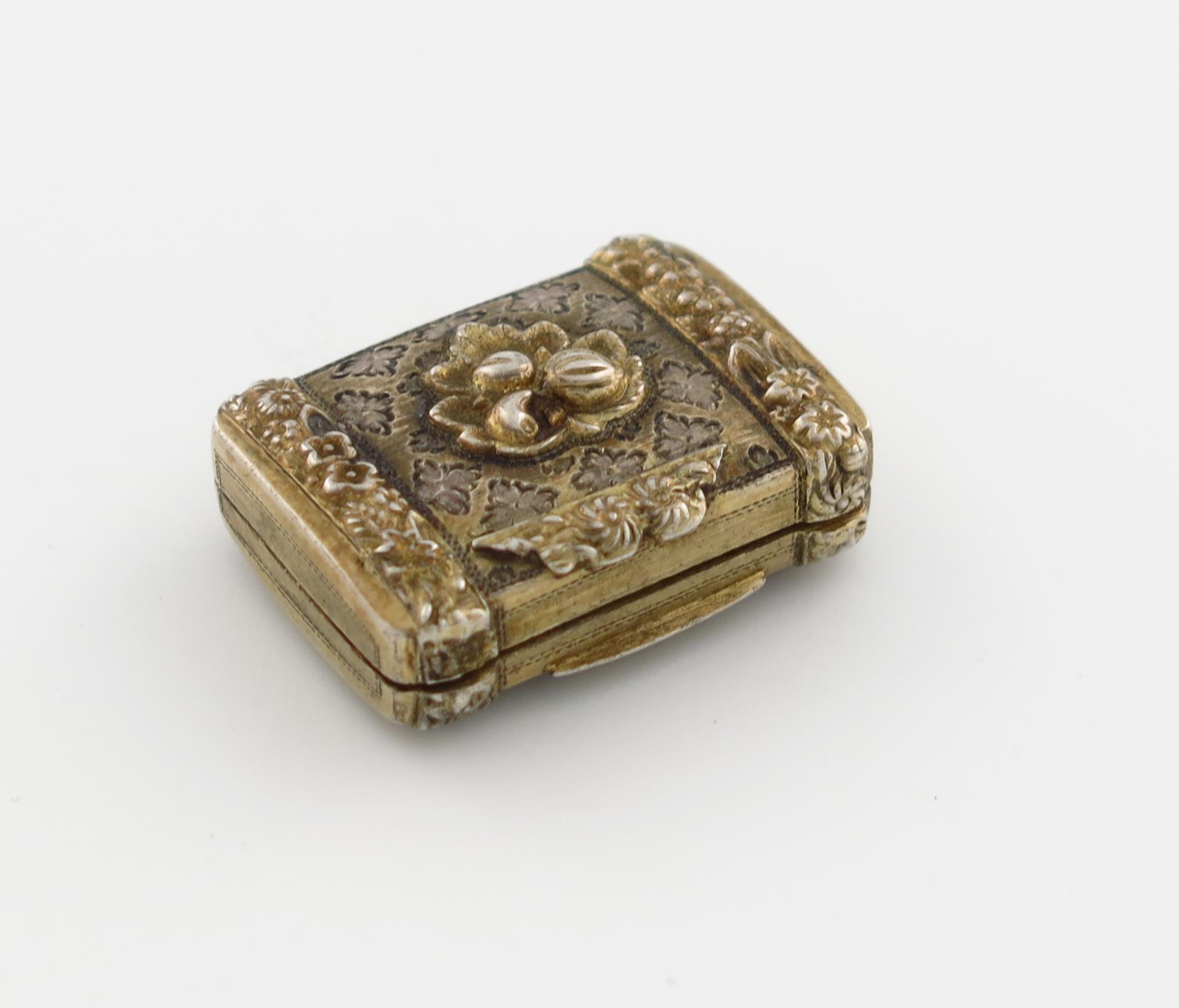 rectangular form, engraved with flowers, foliate borders, with a central foliate motif, pierced foliate scroll grille, length 3cm, approx. weight 0.5oz.