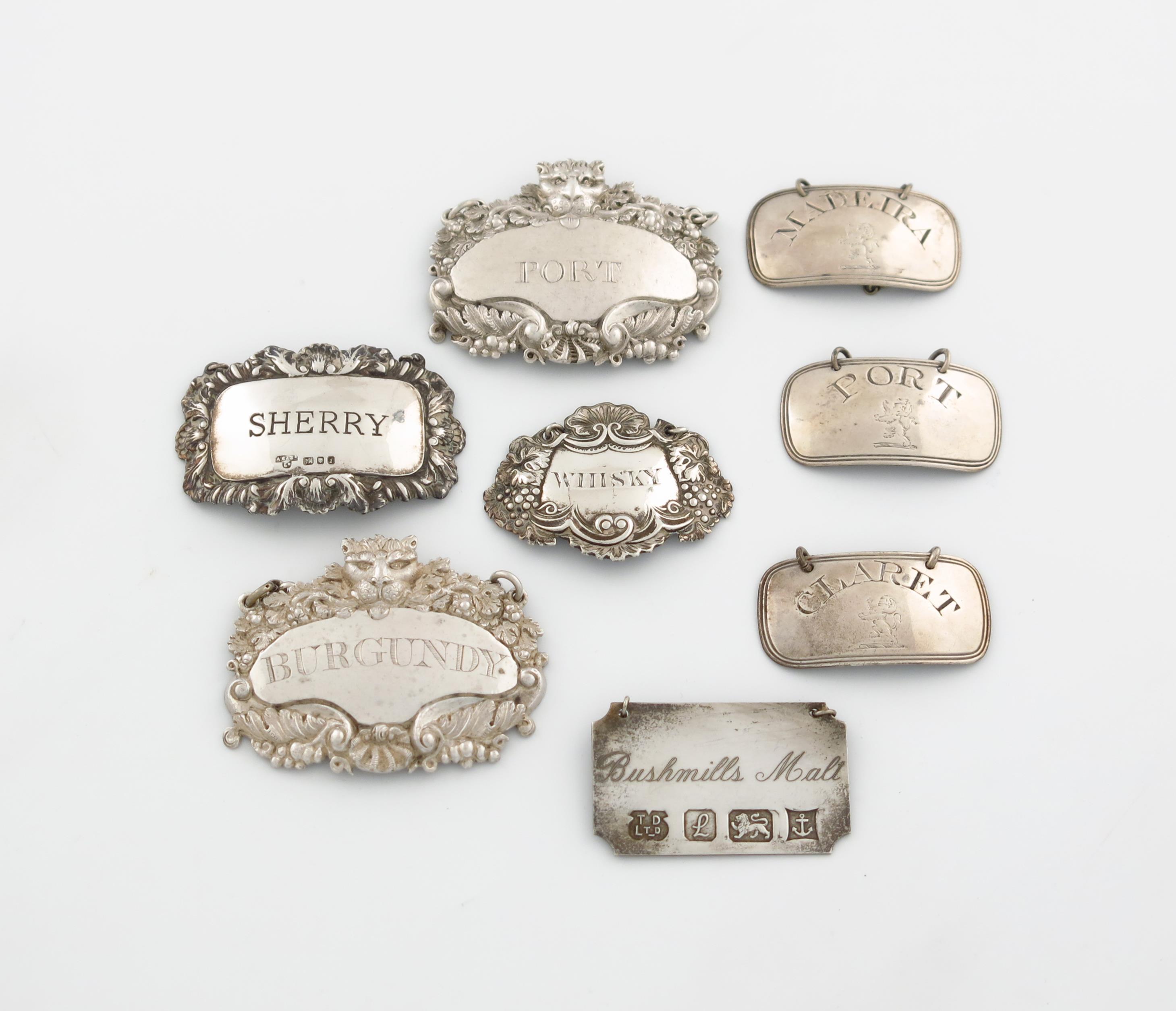 comprising: a set of three George III armorial wine labels, by Phipps and Robinson, London 1796, rounded rectangular form, incised 'PORT', 'CLARET' and 'MADEIRA', above a crest of a rampant lion, plus three modern wine labels and a pair of electroplated wine labels. (8)