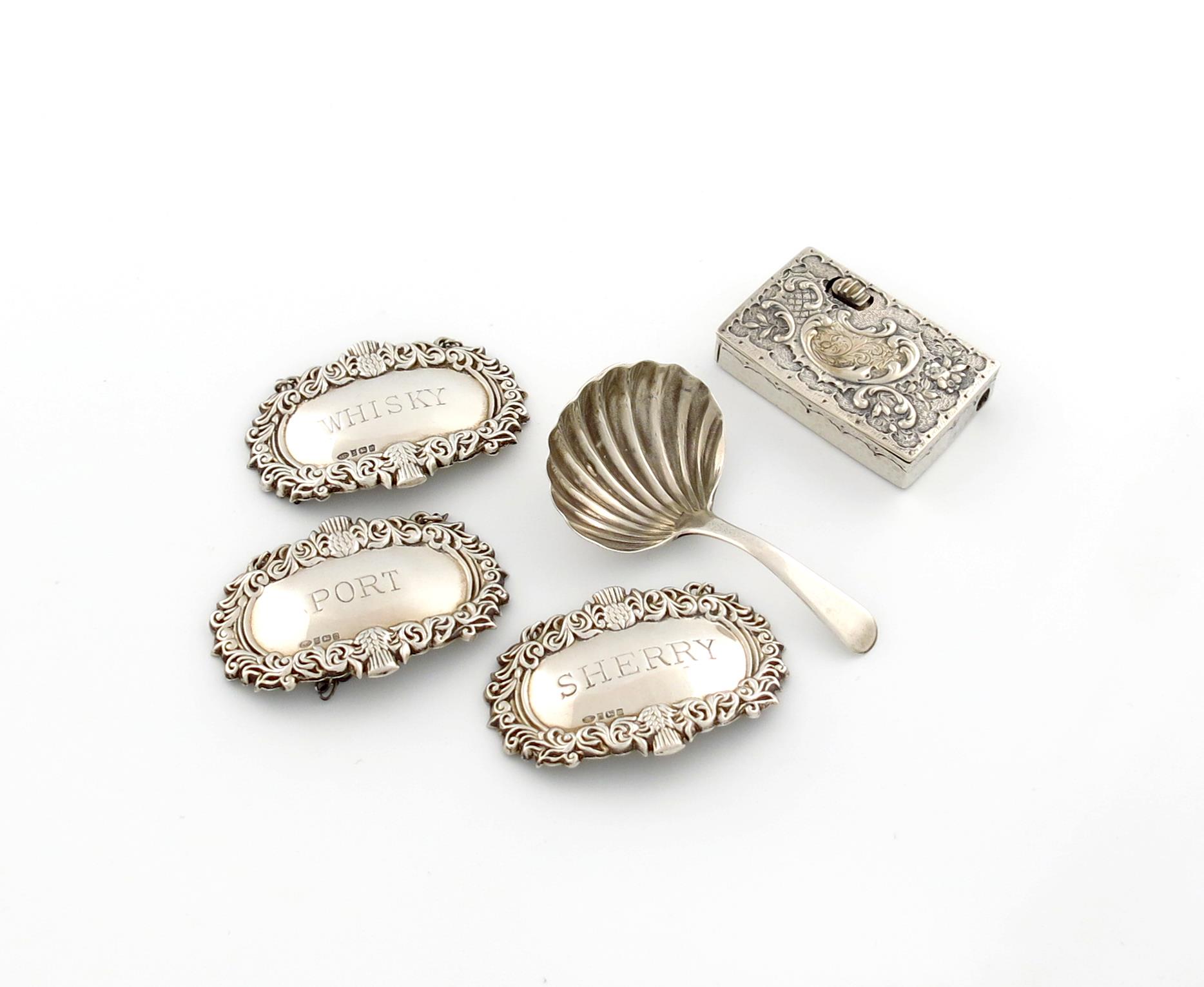 comprising silver items: a set of three modern wine labels, by W I Broadway & Co, Birmingham 1996, with foliate and thistle border, inscribed 'WHISKY', 'PORT' and 'SHERRY', a George III caddy spoon, by Urquhart & Hart, London 1811, with a shell shaped bowl, and an Austro-Hungarian matchbox with embossed cover, approx. weight 3.6oz. (5)