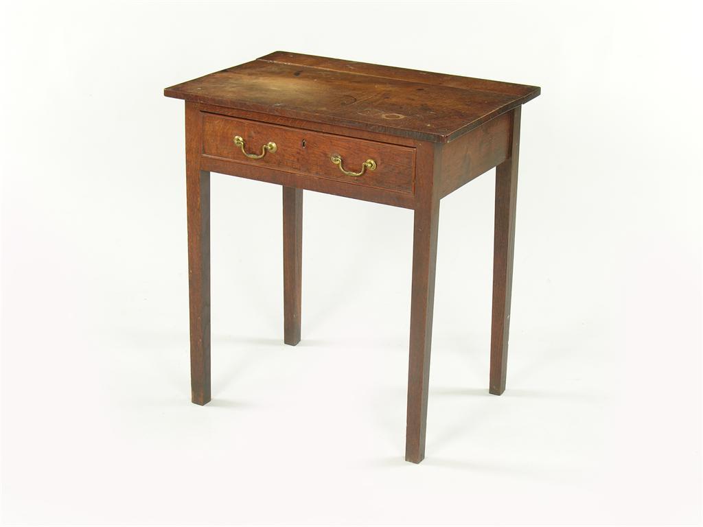 A George III oak side table, the rectangular boarded top above a frieze drawer fitted original brass handles, 28.75in (73cm) h, 26in (66cm) w, 18in (46cm) d.