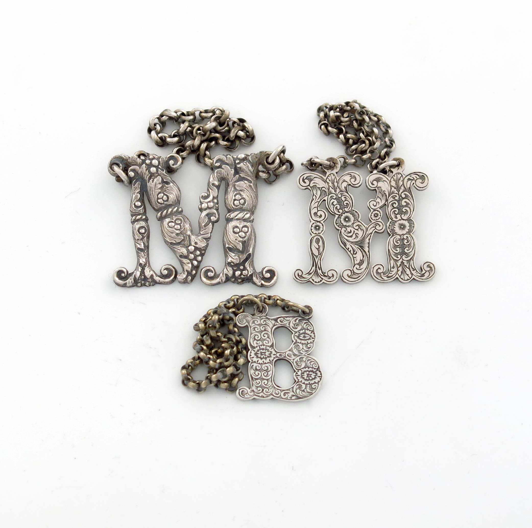 modelled as the letter 'M', with foliate scroll decoration, plus another Victorian wine label 'M', by the same maker, London 1860, and an electroplated wine label 'B', approx. weighable 1.4oz. (3)