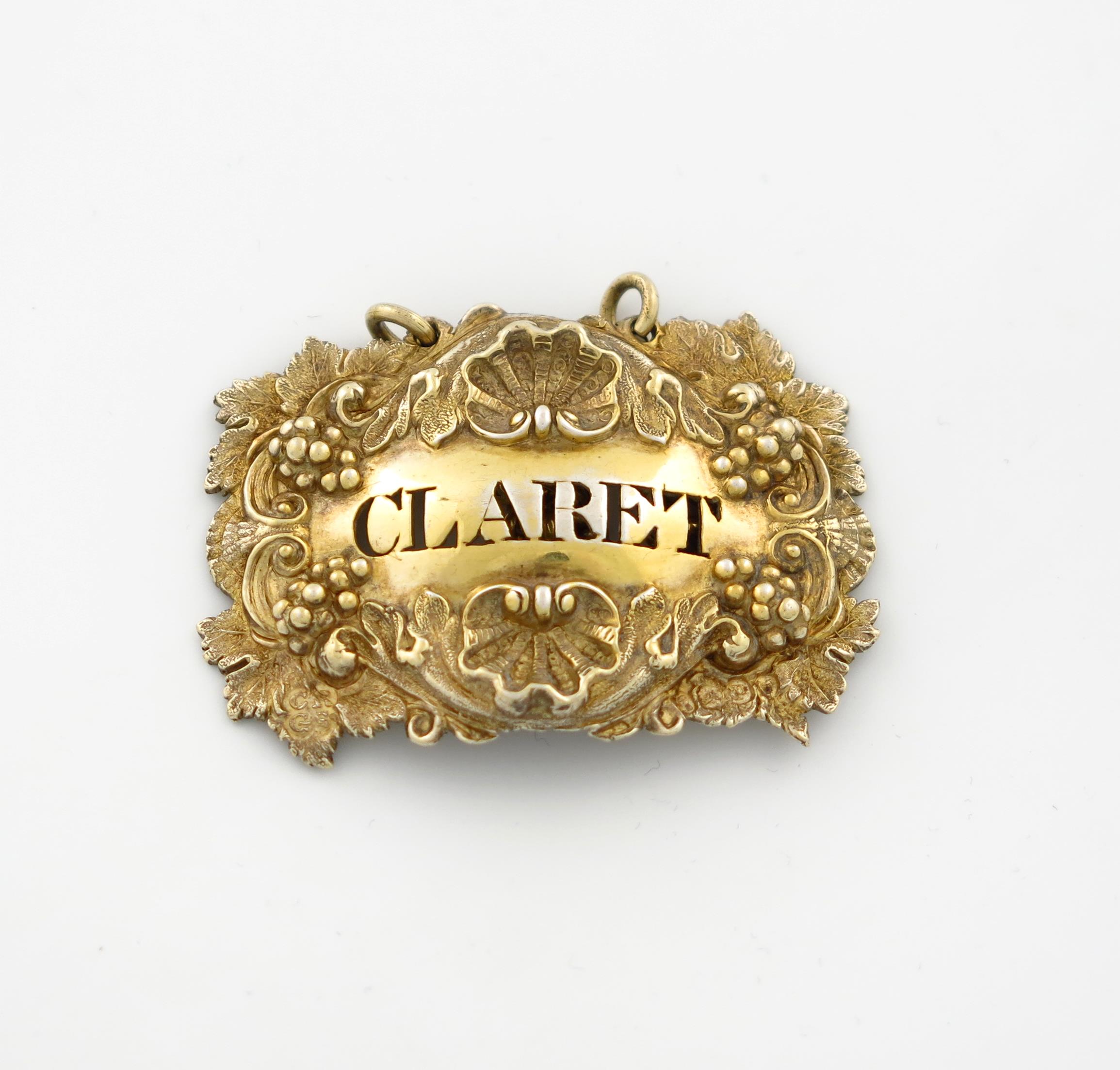 shaped oblong form, with shell and grapevine decoration, pierced 'CLARET', length 5.6cm.