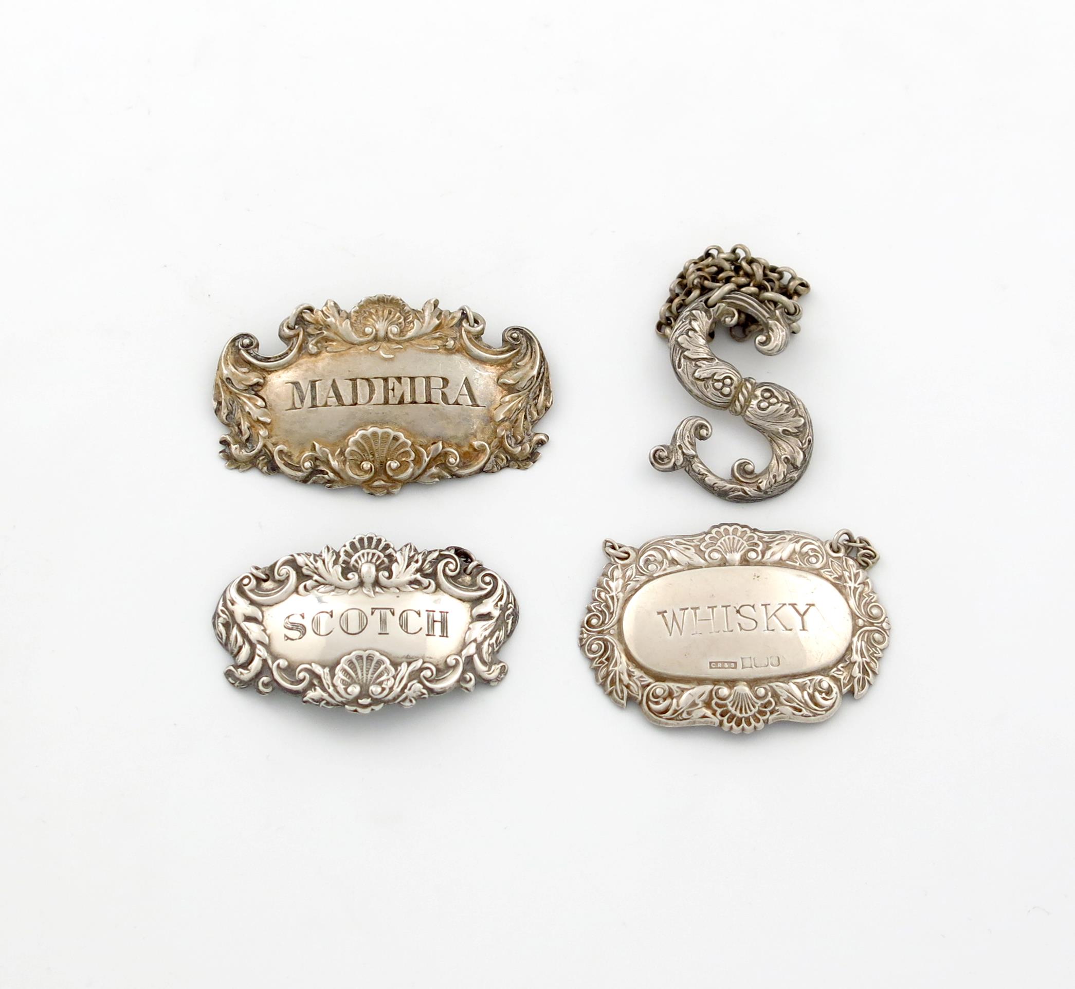 comprising: a George IV label, by William Hattersley, London 1828, shaped form, scroll and shell borders, incised 'MADEIRA', plus a Victorian cut-out letter label, 'S', by Rawlings and Summers, London 1847, foliate decoration, and two modern labels, approx. total weight 2oz. (4)