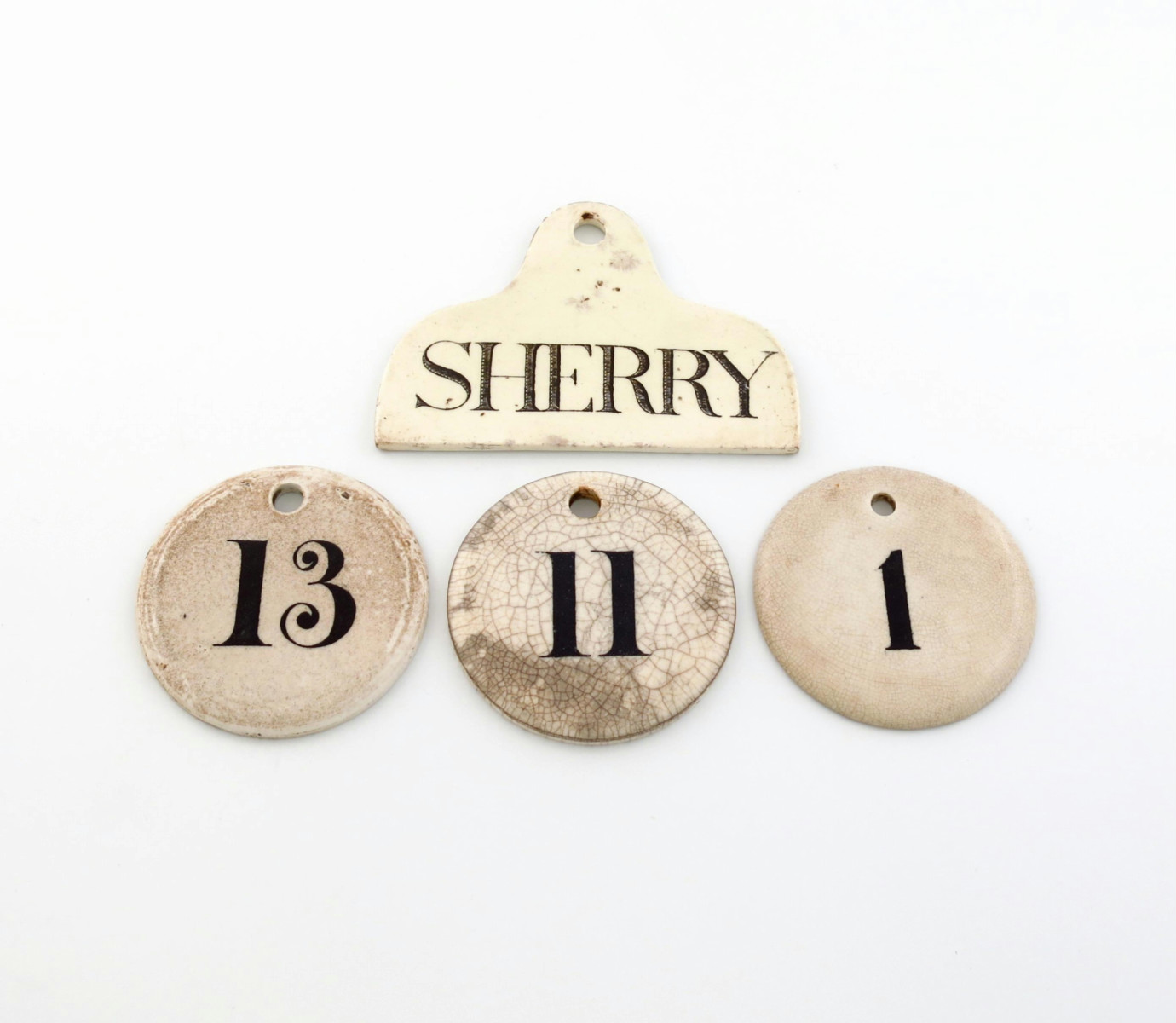 comprising: one of arched rectangular form, titled 'SHERRY', length 13.4cm, and three of circular form, by Farrow and Jackson, London, numbered '13', '11', and '1'. (4)