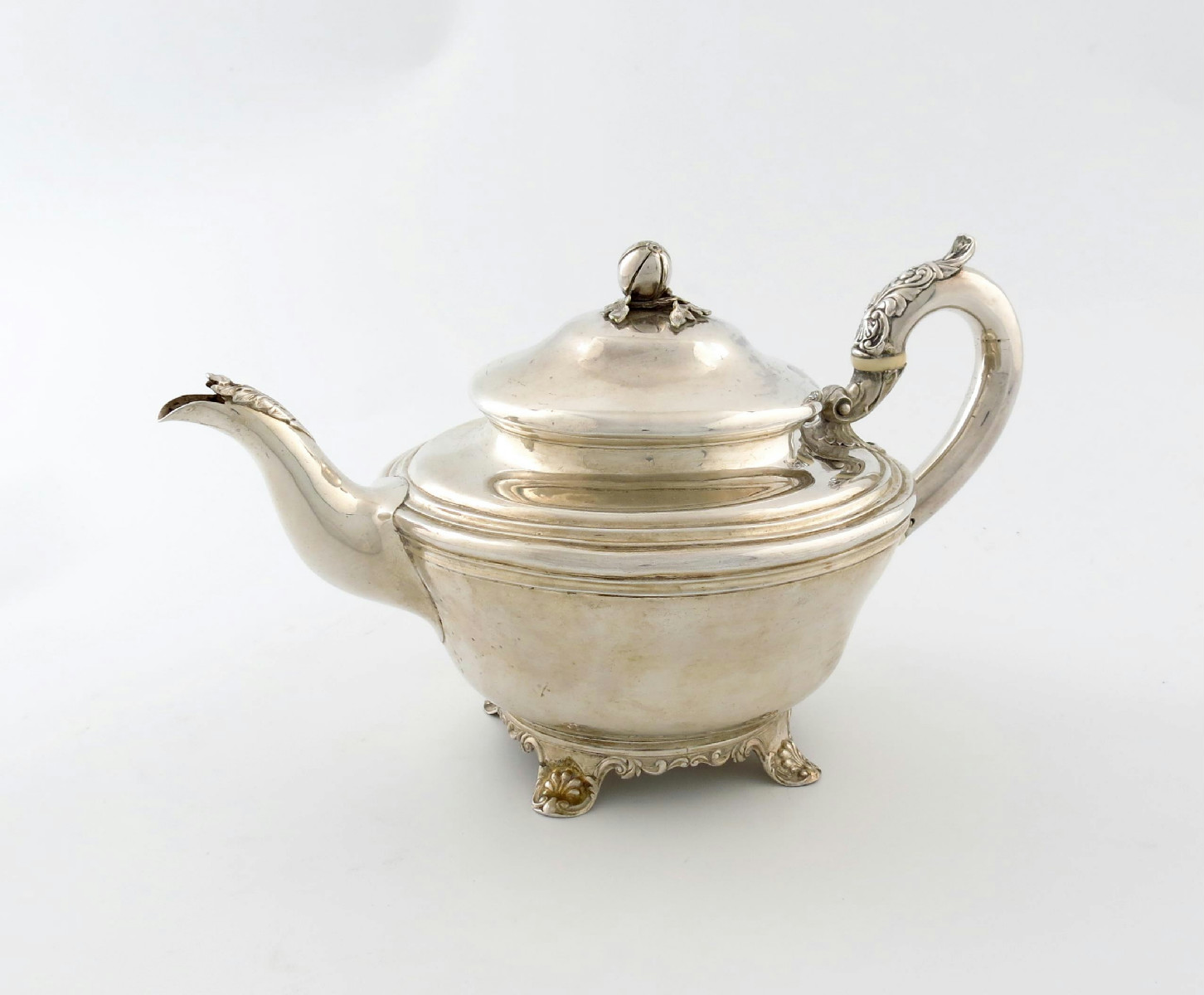 tapering circular form, leaf capped scroll handle, domed hinged cover with a melon finial, on four shell bracket feet, with a later monogram, length handle to spout 29cm, approx. weight 22.4oz.
