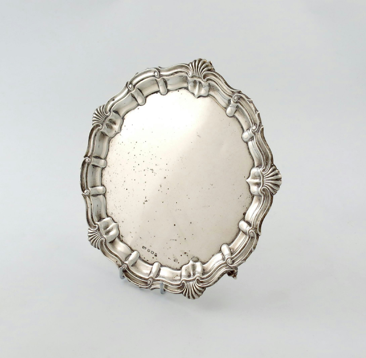circular form, shell and scroll border, on three gnarl feet, diameter 25cm, approx. weight 17.5oz.