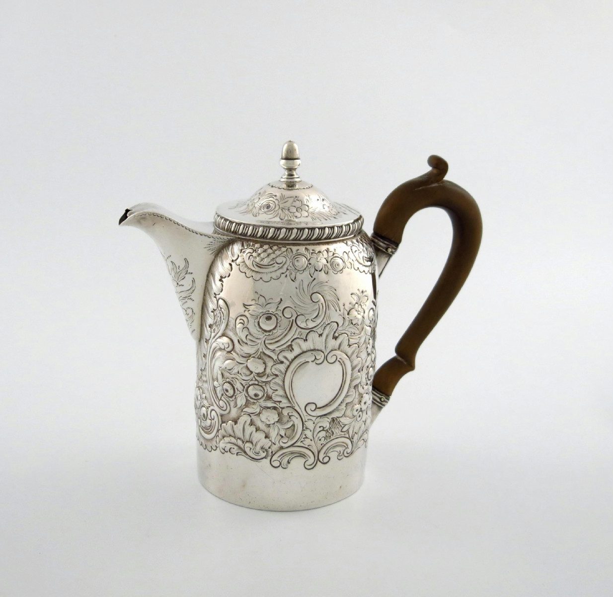 cylindrical form, scroll handle, later foliate scroll decoration, flush-hinged domed cover, height 18.5cm, approx. weight 18.5oz.