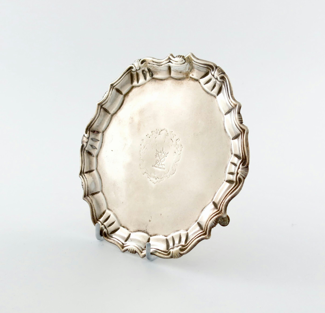 circular form, shell and scroll border, the centre with a crest, on three hoof feet, the underside with a crest and initials, diameter 16.7cm, approx. weight 8oz.