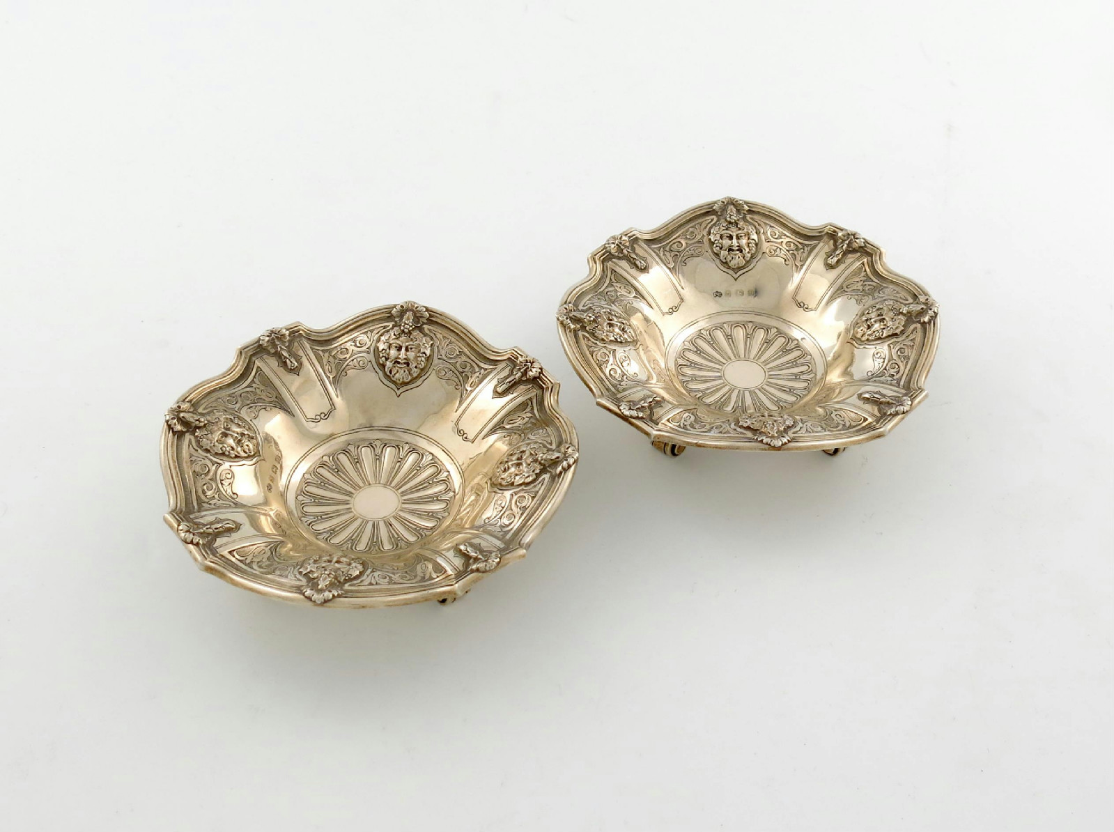circular form, chased with masks and foliate scroll decoration on a matted background, on four scroll feet, diameter 14cm, approx. weight 14.7oz. (2)