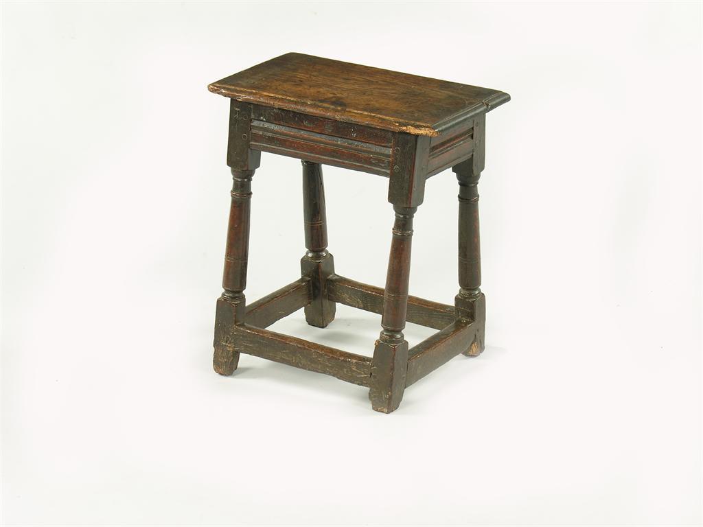A late 17th century oak joined stool, with a moulded band frieze on turned tapering and block legs, 21in (53.2cm) h, 18in x 10.75in (45.8 x 27.2cm).