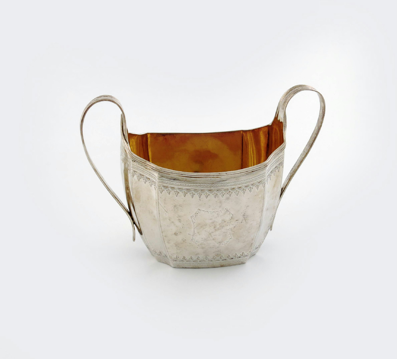 shaped rectangular form, gilded bowl, scroll handles, engraved foliate decoration, height 12cm, approx. weight 7oz.