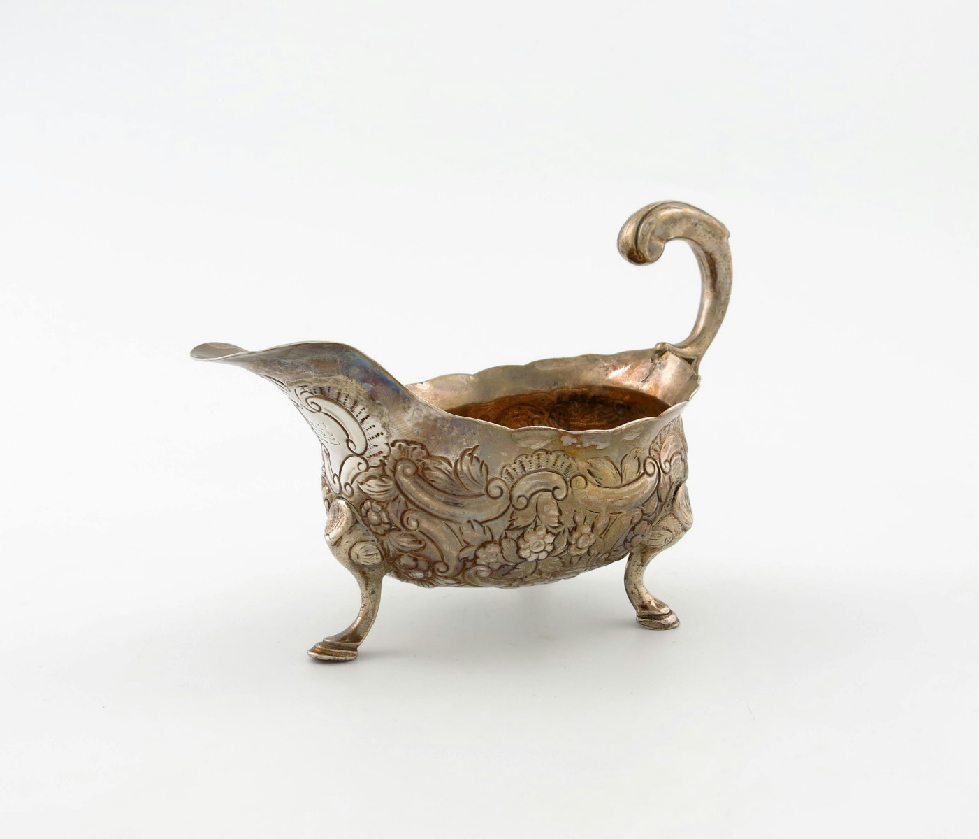 oval form, leaf capped scroll handle, chased foliate scroll decoration, engraved with a crest, on three scroll feet, length 16.5cm, approx. weight 8oz.